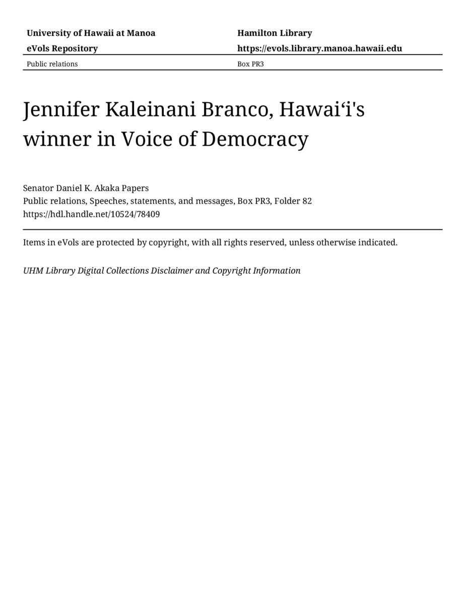 Jennifer Kaleinani Branco, Hawaiʻi's winner in Voice of Democracy