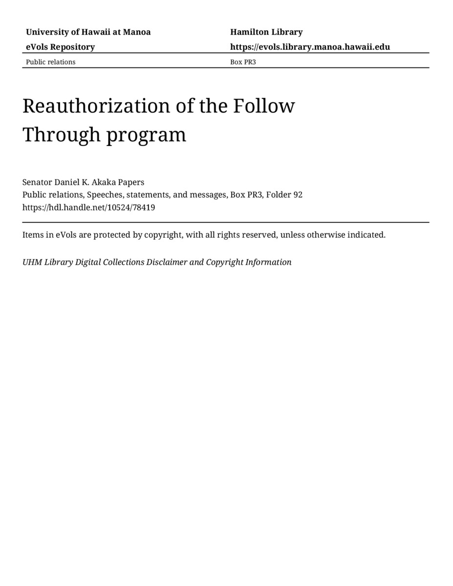 Reauthorization of the Follow Through program, June 14, 1990, MANUSCRIPT-HCPC00010, Public relations, Speeches, statements, and messages, Box PR3, Folder 92, Senator Daniel K. Akaka Papers, Hawaiʻi Congressional Papers Collection, University of Hawaiʻi at Mānoa Library, Honolulu, HI. https://omekas-congress.lib.wvu.edu/catalog/10524_78419 (accessed April 19, 2026).
