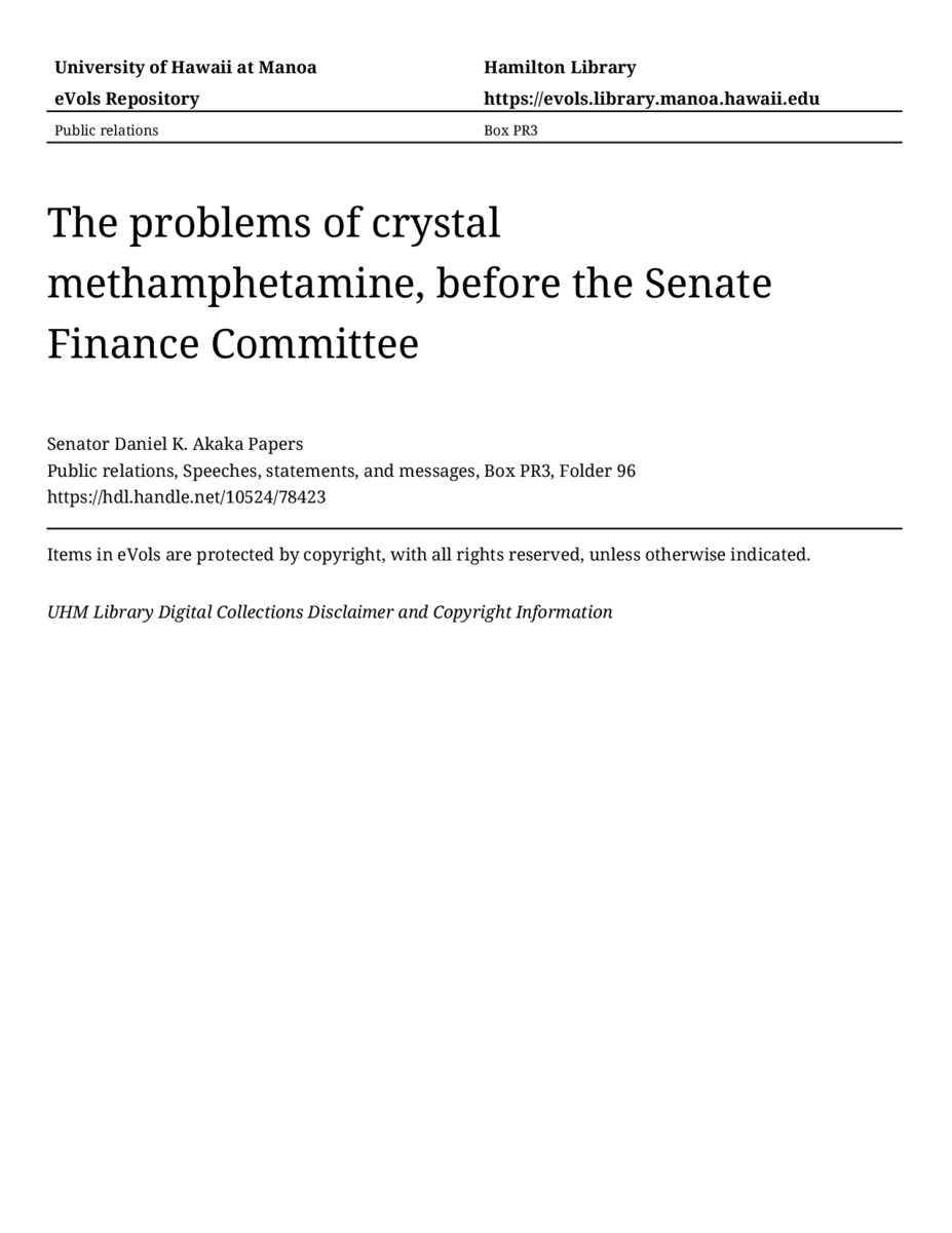 - The problems of crystal methamphetamine, before the Senate Finance Committee