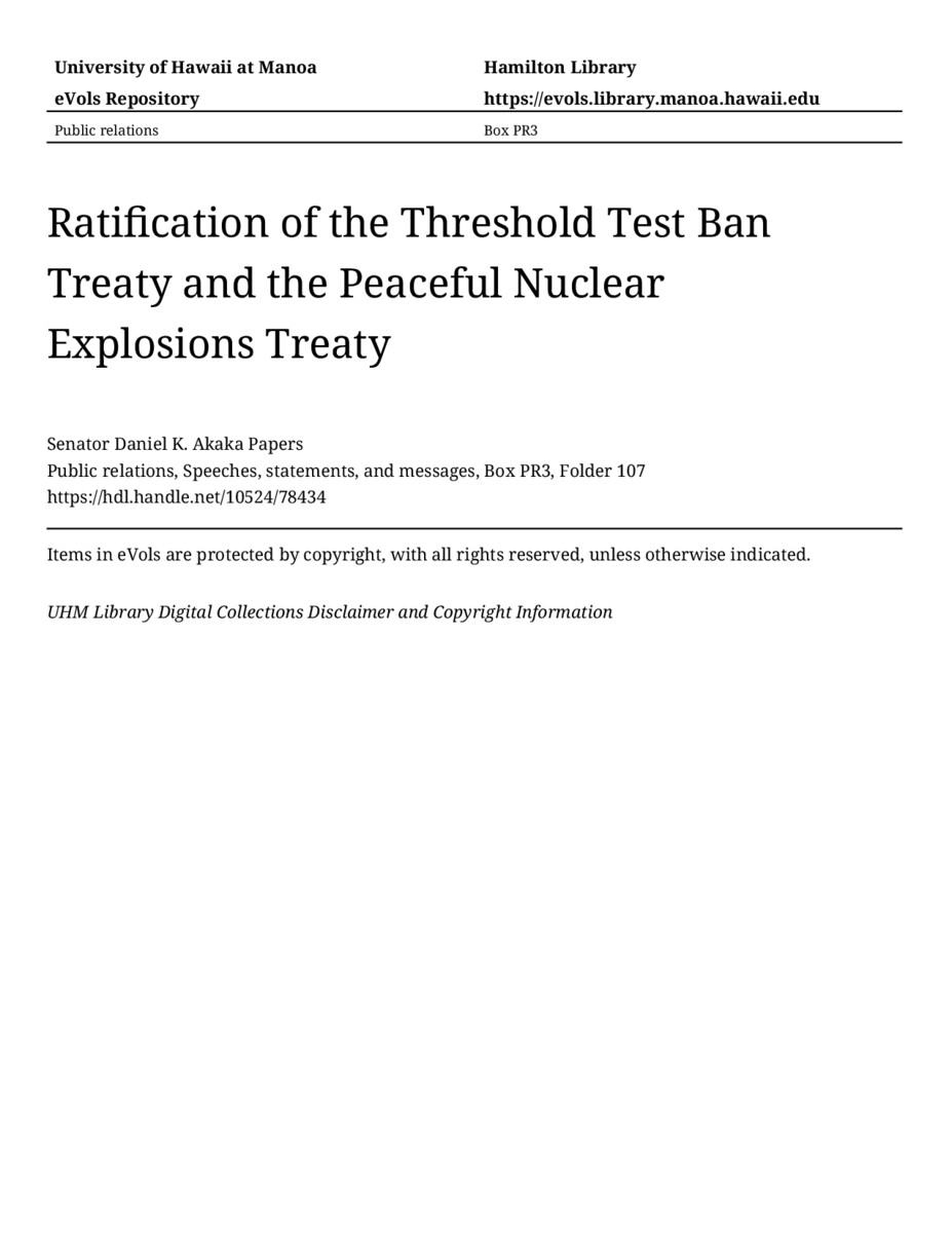 - Ratification of the Threshold Test Ban Treaty and the Peaceful Nuclear Explosions Treaty