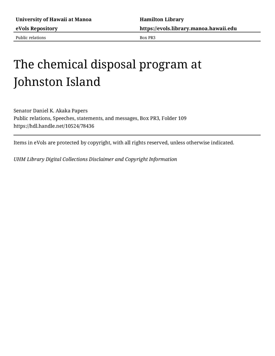 The chemical disposal program at Johnston Island, September 27, 1990, MANUSCRIPT-HCPC00010, Public relations, Speeches, statements, and messages, Box PR3, Folder 109, Senator Daniel K. Akaka Papers, Hawaiʻi Congressional Papers Collection, University of Hawaiʻi at Mānoa Library, Honolulu, HI. https://omekas-congress.lib.wvu.edu/catalog/10524_78436 (accessed April 13, 2026).