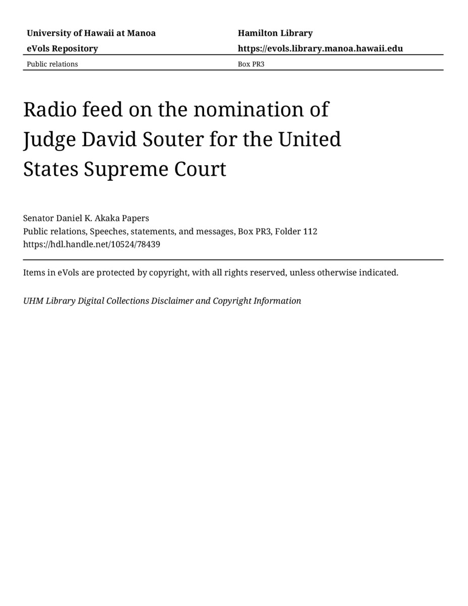 Radio feed on the nomination of Judge David Souter for the United States Supreme Court, approximately September 1990-October 1990, MANUSCRIPT-HCPC00010, Public relations, Speeches, statements, and messages, Box PR3, Folder 112, Senator Daniel K. Akaka Papers, Hawaiʻi Congressional Papers Collection, University of Hawaiʻi at Mānoa Library, Honolulu, HI. https://omekas-congress.lib.wvu.edu/catalog/10524_78439 (accessed April 20, 2026).