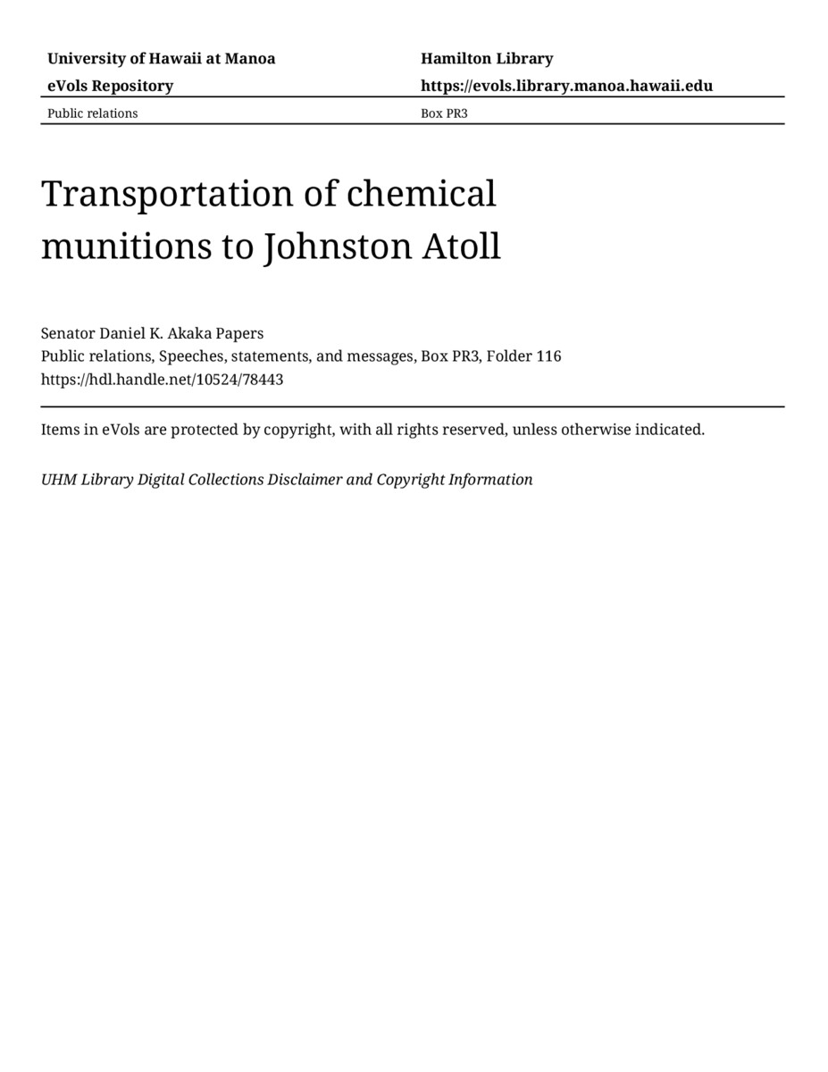 Transportation of chemical munitions to Johnston Atoll, October 15, 1990, MANUSCRIPT-HCPC00010, Public relations, Speeches, statements, and messages, Box PR3, Folder 116, Senator Daniel K. Akaka Papers, Hawaiʻi Congressional Papers Collection, University of Hawaiʻi at Mānoa Library, Honolulu, HI. https://omekas-congress.lib.wvu.edu/catalog/10524_78443 (accessed April 19, 2026).