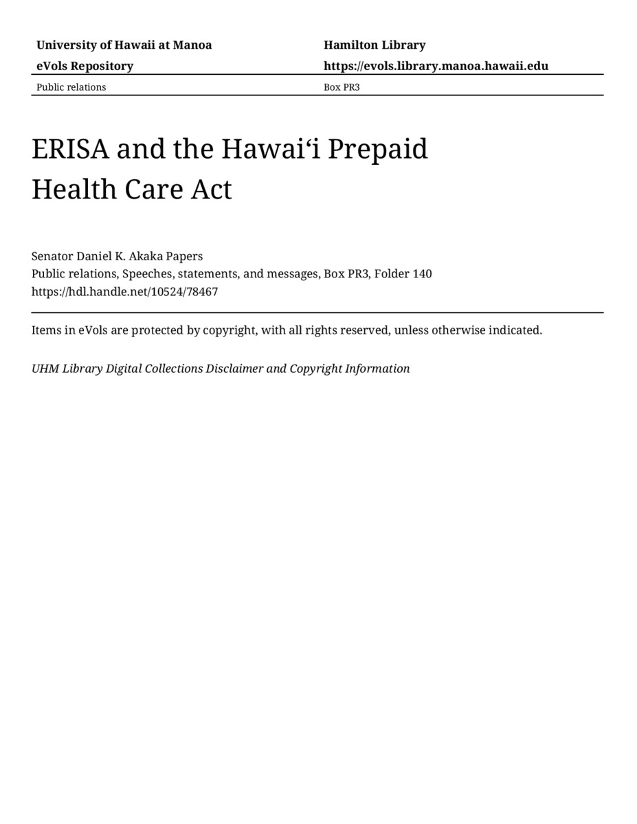 ERISA and the Hawaiʻi Prepaid Health Care Act, March 7, 1991, MANUSCRIPT-HCPC00010, Public relations, Speeches, statements, and messages, Box PR3, Folder 140, Senator Daniel K. Akaka Papers, Hawaiʻi Congressional Papers Collection, University of Hawaiʻi at Mānoa Library, Honolulu, HI. https://omekas-congress.lib.wvu.edu/catalog/10524_78467 (accessed April 18, 2026).