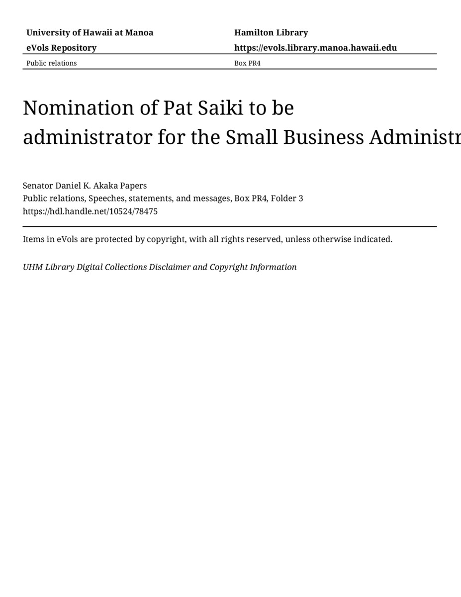 - Nomination of Pat Saiki to be administrator for the Small Business Administration