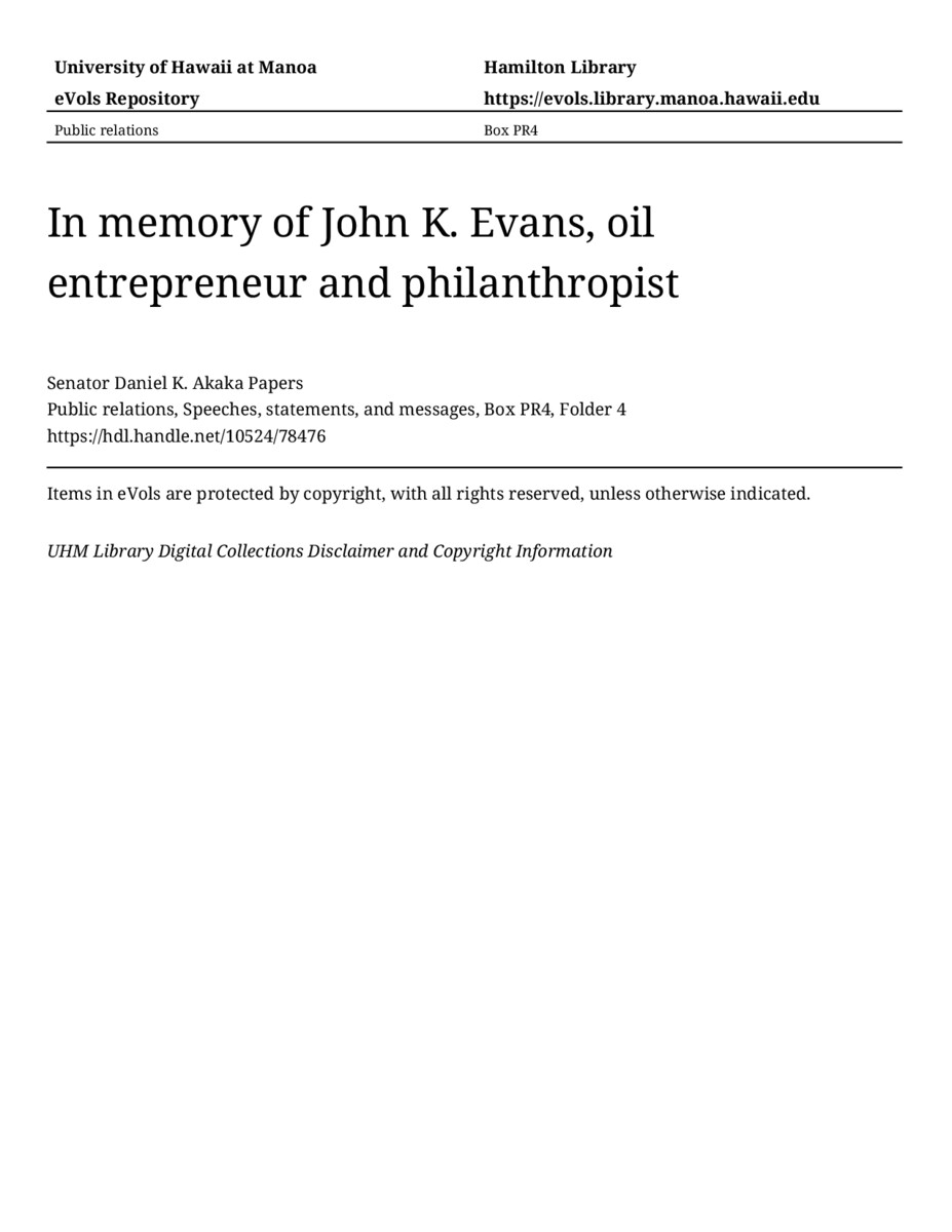 - In memory of John K. Evans, oil entrepreneur and philanthropist