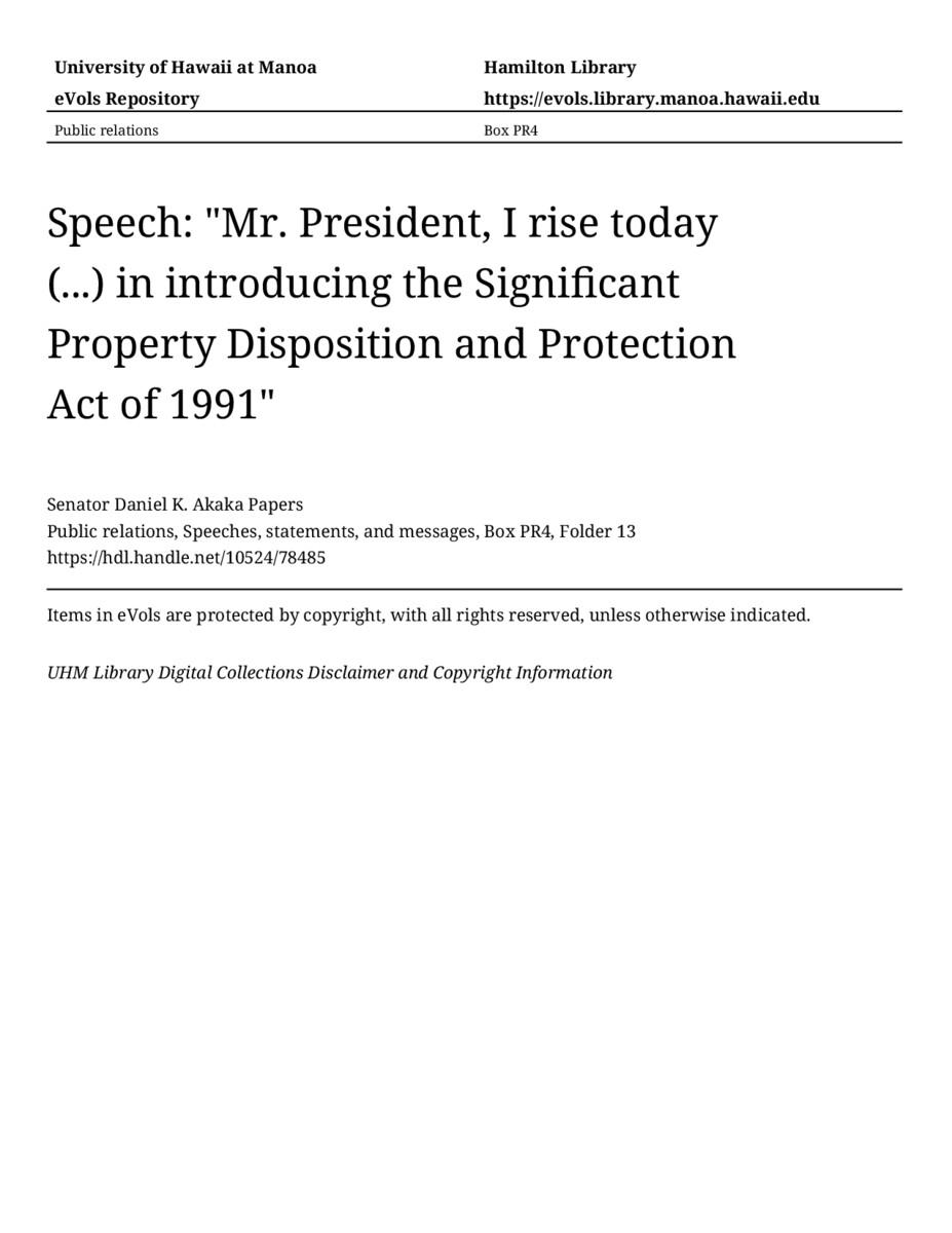 Speech: "Mr. President, I rise today (...) in introducing the Significant Property Disposition and Protection Act of 1991", April 24, 1991, MANUSCRIPT-HCPC00010, Public relations, Speeches, statements, and messages, Box PR4, Folder 13, Senator Daniel K. Akaka Papers, Hawaiʻi Congressional Papers Collection, University of Hawaiʻi at Mānoa Library, Honolulu, HI. https://omekas-congress.lib.wvu.edu/catalog/10524_78485 (accessed April 09, 2026).