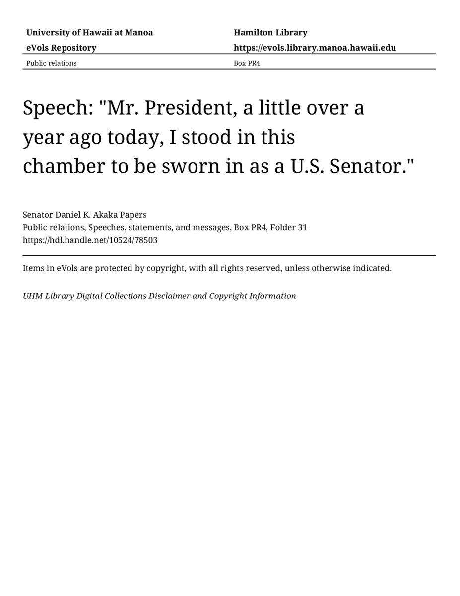 Speech: "Mr. President, a little over a year ago today, I stood in this chamber to be sworn in as a U.S. Senator.", May 22, 1991, MANUSCRIPT-HCPC00010, Public relations, Speeches, statements, and messages, Box PR4, Folder 31, Senator Daniel K. Akaka Papers, Hawaiʻi Congressional Papers Collection, University of Hawaiʻi at Mānoa Library, Honolulu, HI. https://omekas-congress.lib.wvu.edu/catalog/10524_78503 (accessed April 20, 2026).
