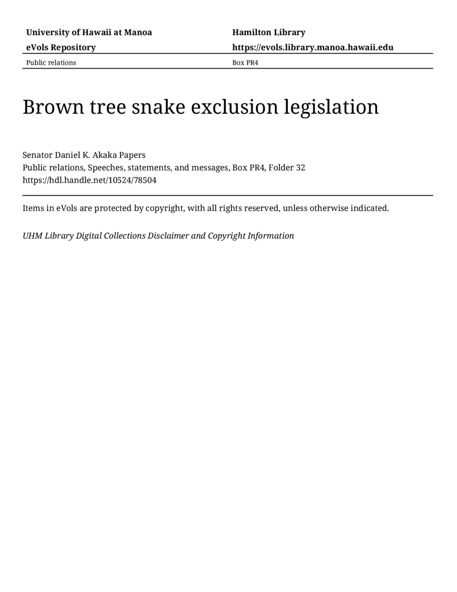 Brown tree snake exclusion legislation, May 23, 1991, MANUSCRIPT-HCPC00010, Public relations, Speeches, statements, and messages, Box PR4, Folder 32, Senator Daniel K. Akaka Papers, Hawaiʻi Congressional Papers Collection, University of Hawaiʻi at Mānoa Library, Honolulu, HI. https://omekas-congress.lib.wvu.edu/catalog/10524_78504 (accessed April 09, 2026).