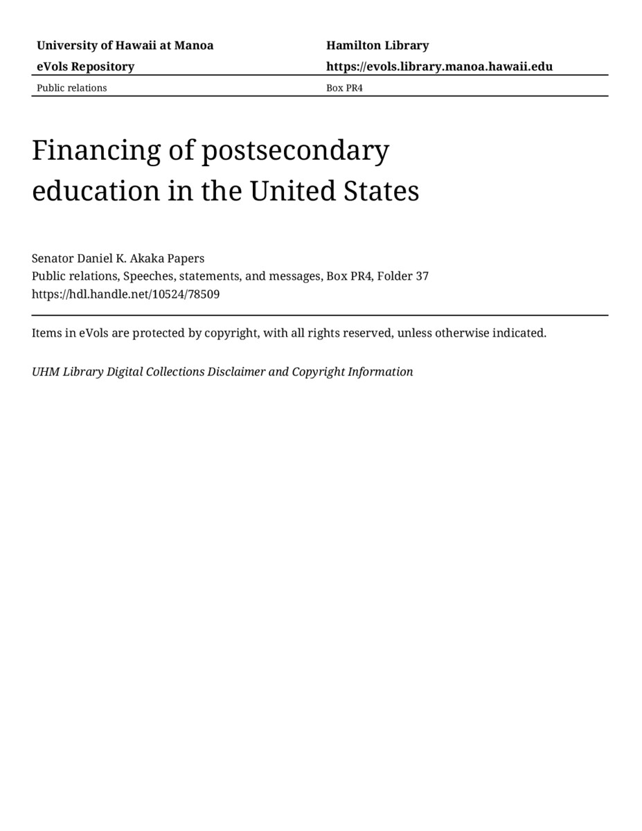 Financing of postsecondary education in the United States, June 3, 1991, MANUSCRIPT-HCPC00010, Public relations, Speeches, statements, and messages, Box PR4, Folder 37, Senator Daniel K. Akaka Papers, Hawaiʻi Congressional Papers Collection, University of Hawaiʻi at Mānoa Library, Honolulu, HI. https://omekas-congress.lib.wvu.edu/catalog/10524_78509 (accessed April 25, 2026).