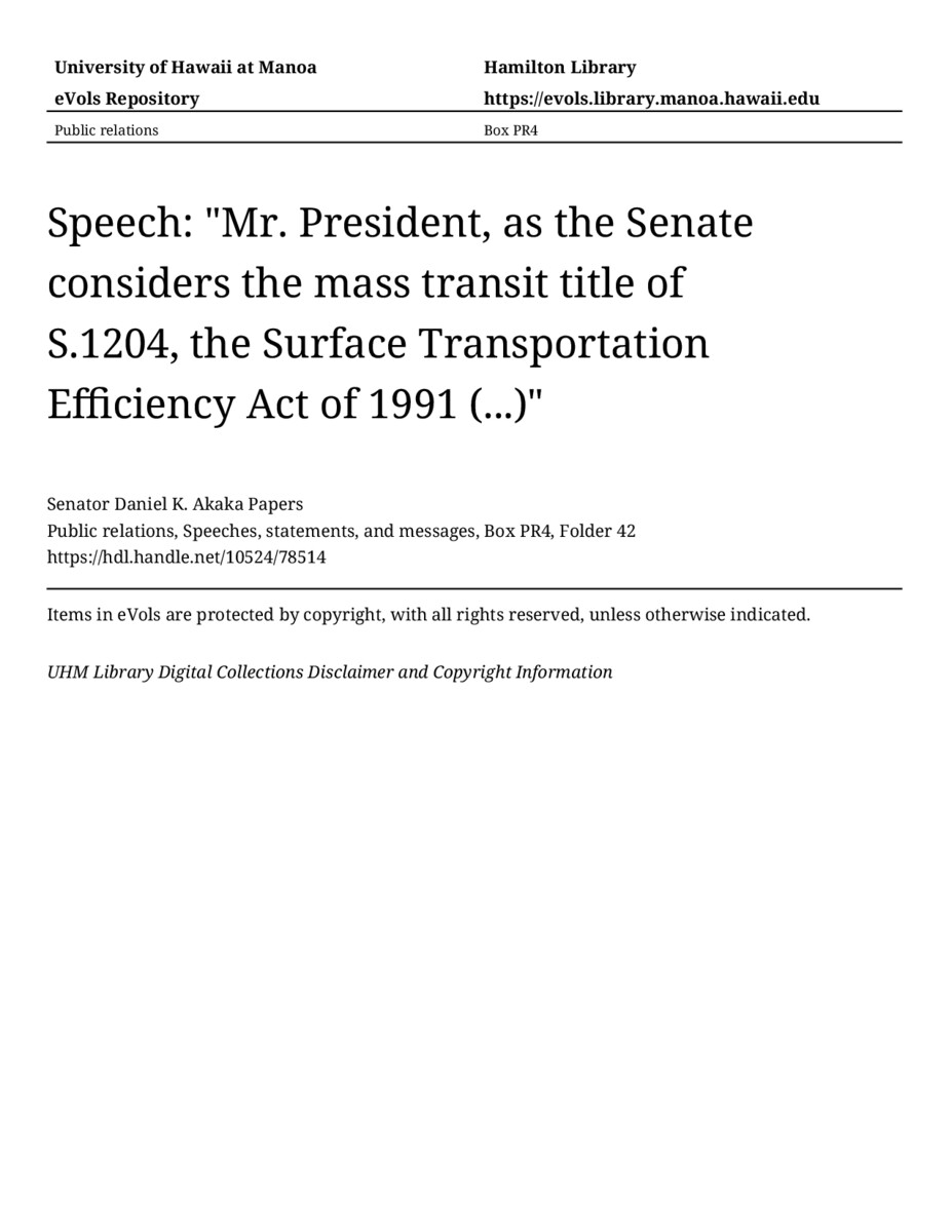 Speech: "Mr. President, as the Senate considers the mass transit title of S.1204, the Surface Transportation Efficiency Act of 1991 (...)", June 13, 1991, MANUSCRIPT-HCPC00010, Public relations, Speeches, statements, and messages, Box PR4, Folder 42, Senator Daniel K. Akaka Papers, Hawaiʻi Congressional Papers Collection, University of Hawaiʻi at Mānoa Library, Honolulu, HI. https://omekas-congress.lib.wvu.edu/catalog/10524_78514 (accessed April 19, 2026).