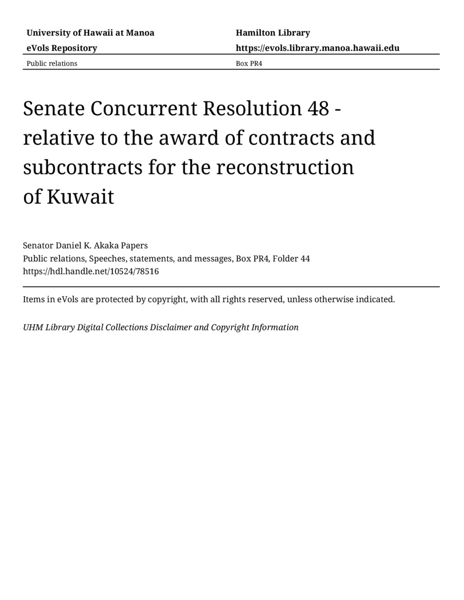Senate Concurrent Resolution 48 - relative to the award of contracts and subcontracts for the reconstruction of Kuwait, June 17, 1991, MANUSCRIPT-HCPC00010, Public relations, Speeches, statements, and messages, Box PR4, Folder 44, Senator Daniel K. Akaka Papers, Hawaiʻi Congressional Papers Collection, University of Hawaiʻi at Mānoa Library, Honolulu, HI. https://omekas-congress.lib.wvu.edu/catalog/10524_78516 (accessed April 10, 2026).