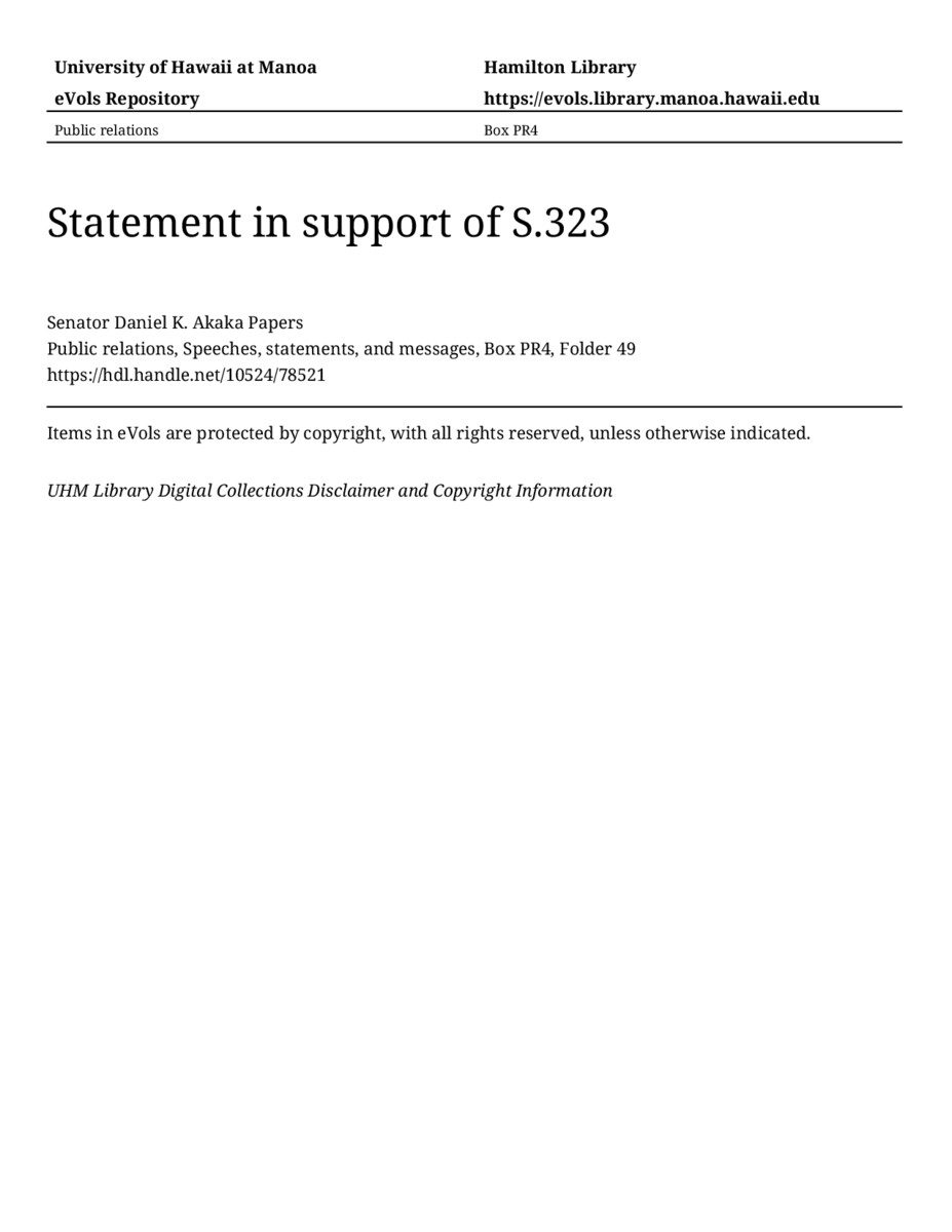 Statement in support of S.323, July 16, 1991, MANUSCRIPT-HCPC00010, Public relations, Speeches, statements, and messages, Box PR4, Folder 49, Senator Daniel K. Akaka Papers, Hawaiʻi Congressional Papers Collection, University of Hawaiʻi at Mānoa Library, Honolulu, HI. https://omekas-congress.lib.wvu.edu/catalog/10524_78521 (accessed April 18, 2026).