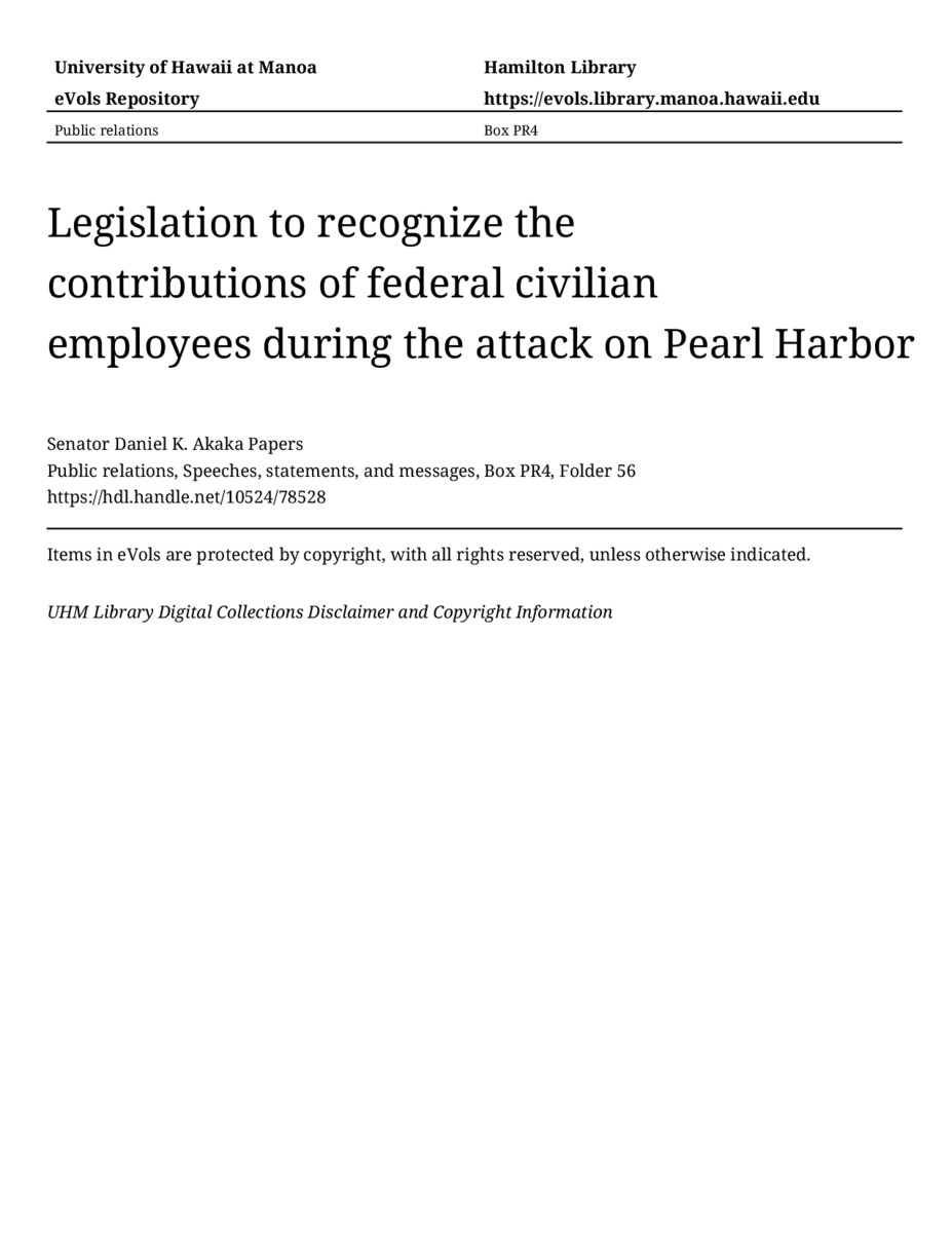 Legislation to recognize the contributions of federal civilian employees during the attack on Pearl Harbor, September 18, 1991, MANUSCRIPT-HCPC00010, Public relations, Speeches, statements, and messages, Box PR4, Folder 56, Senator Daniel K. Akaka Papers, Hawaiʻi Congressional Papers Collection, University of Hawaiʻi at Mānoa Library, Honolulu, HI. https://omekas-congress.lib.wvu.edu/catalog/10524_78528 (accessed April 21, 2026).