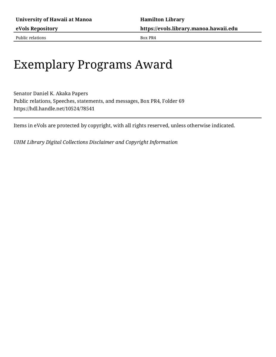 Exemplary Programs Award, October 18, 1991, MANUSCRIPT-HCPC00010, Public relations, Speeches, statements, and messages, Box PR4, Folder 69, Senator Daniel K. Akaka Papers, Hawaiʻi Congressional Papers Collection, University of Hawaiʻi at Mānoa Library, Honolulu, HI. https://omekas-congress.lib.wvu.edu/catalog/10524_78541 (accessed April 17, 2026).