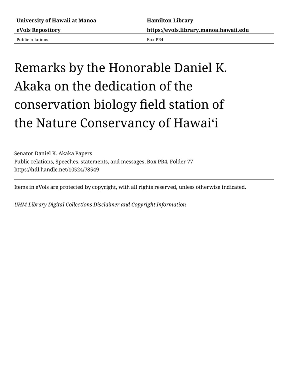 Remarks by the Honorable Daniel K. Akaka on the dedication of the conservation biology field station of the Nature Conservancy of Hawaiʻi, December 9, 1991, MANUSCRIPT-HCPC00010, Public relations, Speeches, statements, and messages, Box PR4, Folder 77, Senator Daniel K. Akaka Papers, Hawaiʻi Congressional Papers Collection, University of Hawaiʻi at Mānoa Library, Honolulu, HI. https://omekas-congress.lib.wvu.edu/catalog/10524_78549 (accessed April 10, 2026).