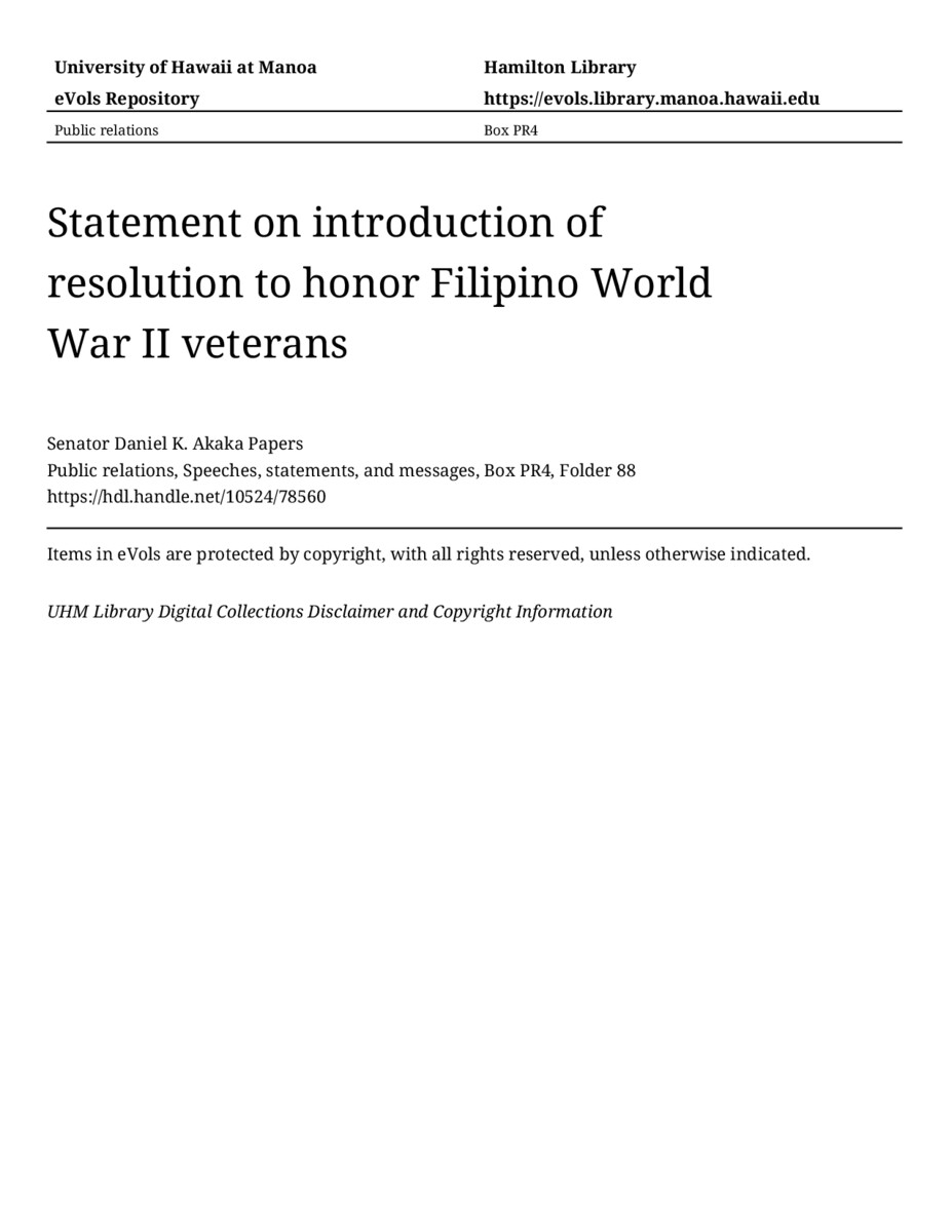 - Statement on introduction of resolution to honor Filipino World War II veterans