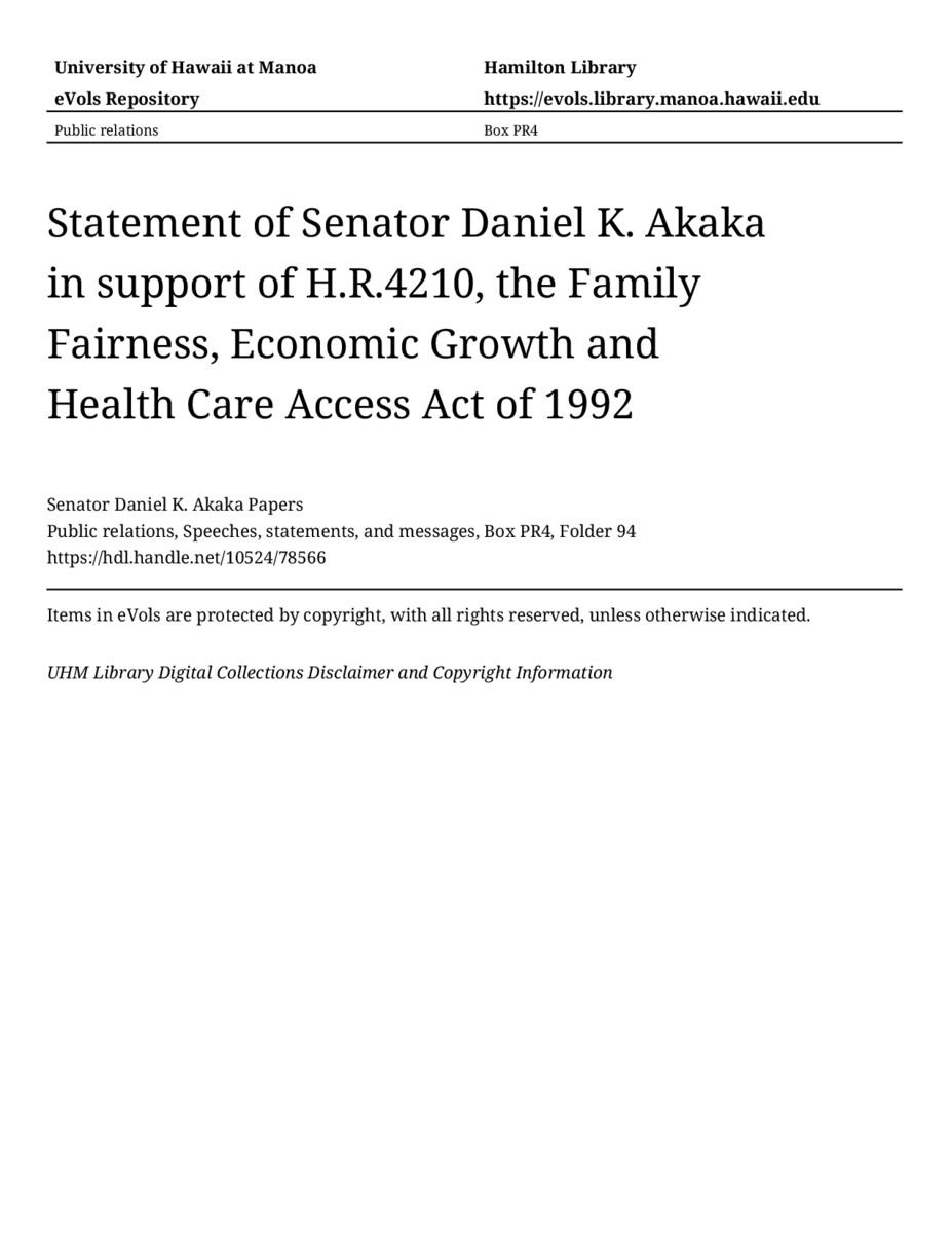 Statement of Senator Daniel K. Akaka in support of H.R.4210, the Family Fairness, Economic Growth and Health Care Access Act of 1992, March 10, 1992, MANUSCRIPT-HCPC00010, Public relations, Speeches, statements, and messages, Box PR4, Folder 94, Senator Daniel K. Akaka Papers, Hawaiʻi Congressional Papers Collection, University of Hawaiʻi at Mānoa Library, Honolulu, HI. https://omekas-congress.lib.wvu.edu/catalog/10524_78566 (accessed April 18, 2026).
