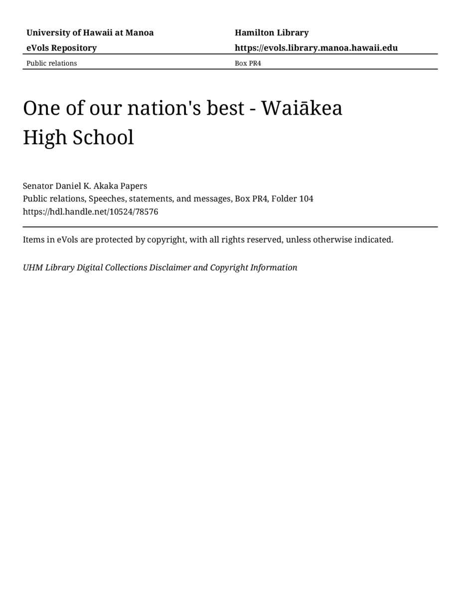 One of our nation's best - Waiākea High School, April 29, 1992, MANUSCRIPT-HCPC00010, Public relations, Speeches, statements, and messages, Box PR4, Folder 104, Senator Daniel K. Akaka Papers, Hawaiʻi Congressional Papers Collection, University of Hawaiʻi at Mānoa Library, Honolulu, HI. https://omekas-congress.lib.wvu.edu/catalog/10524_78576 (accessed April 27, 2026).