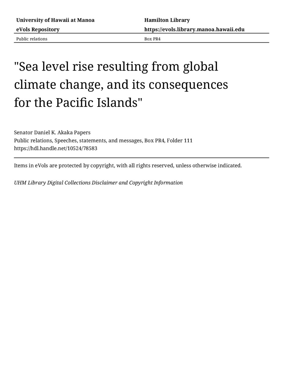 - "Sea level rise resulting from global climate change, and its consequences for the Pacific Islands"