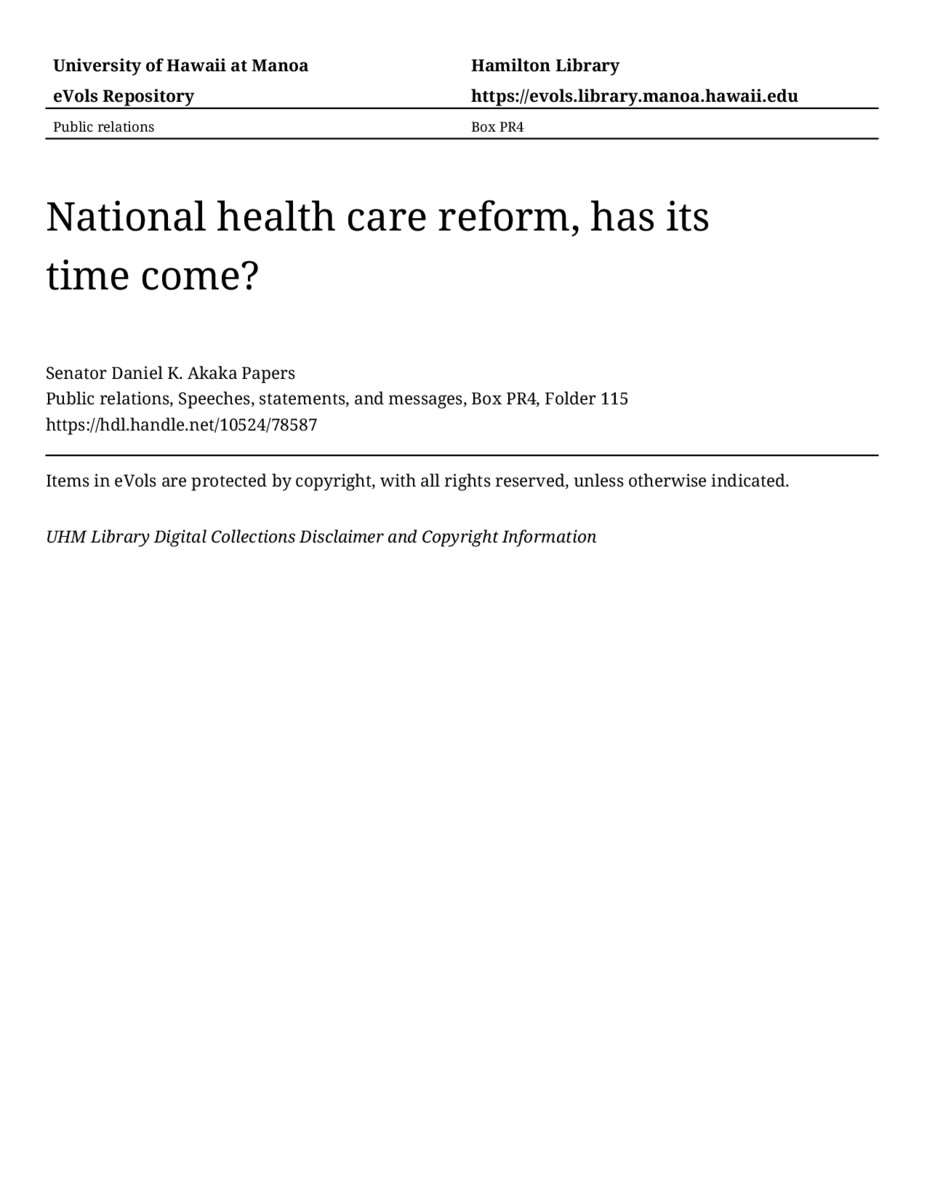 National health care reform, has its time come?, May 29, 1992, MANUSCRIPT-HCPC00010, Public relations, Speeches, statements, and messages, Box PR4, Folder 115, Senator Daniel K. Akaka Papers, Hawaiʻi Congressional Papers Collection, University of Hawaiʻi at Mānoa Library, Honolulu, HI. https://omekas-congress.lib.wvu.edu/catalog/10524_78587 (accessed April 21, 2026).