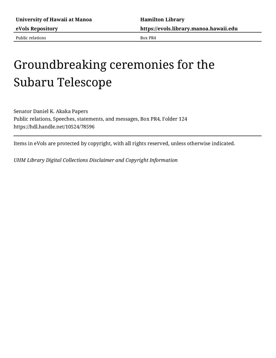 Groundbreaking ceremonies for the Subaru Telescope, July 6, 1992, MANUSCRIPT-HCPC00010, Public relations, Speeches, statements, and messages, Box PR4, Folder 124, Senator Daniel K. Akaka Papers, Hawaiʻi Congressional Papers Collection, University of Hawaiʻi at Mānoa Library, Honolulu, HI. https://omekas-congress.lib.wvu.edu/catalog/10524_78596 (accessed April 09, 2026).