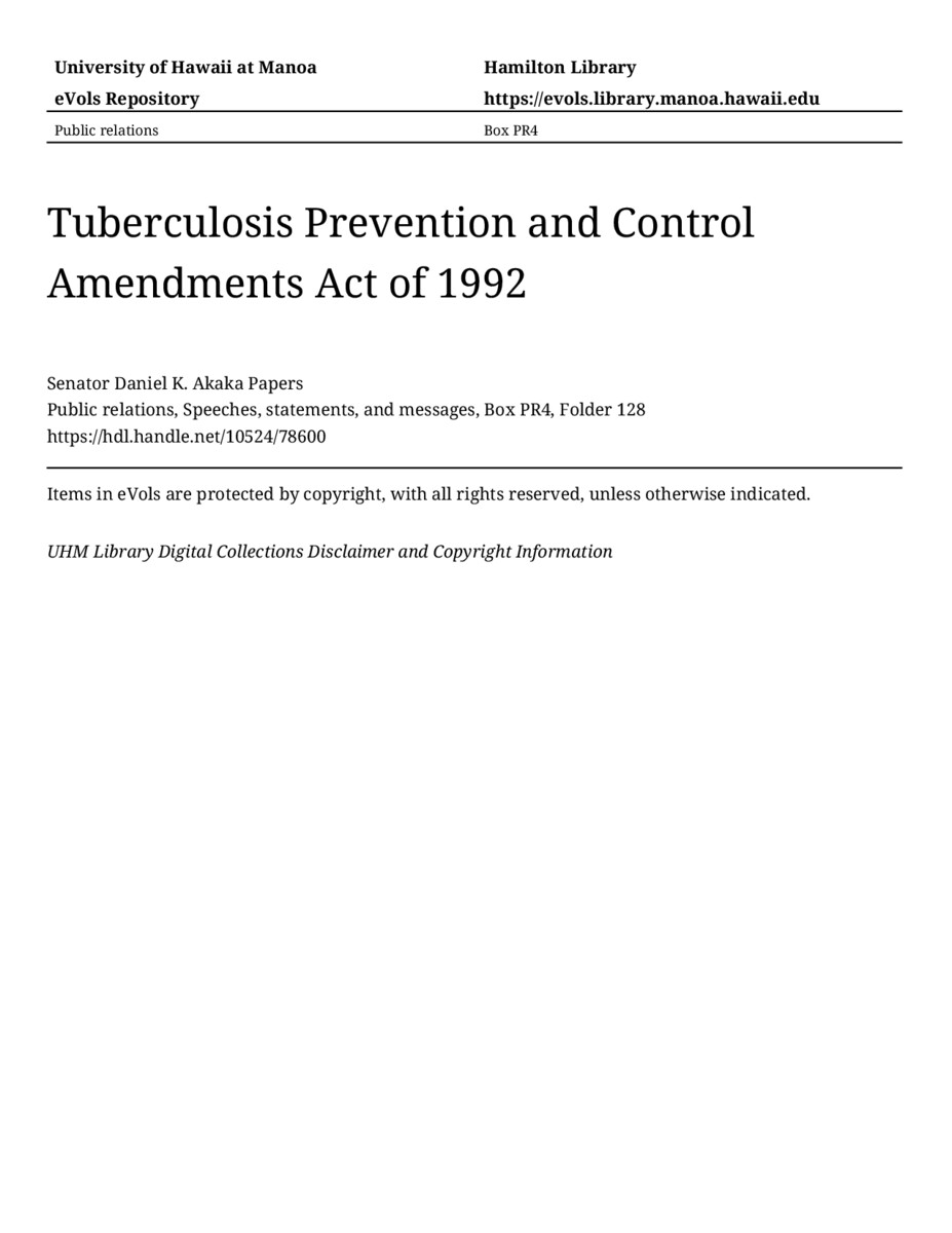 Tuberculosis Prevention and Control Amendments Act of 1992, July 24, 1992, MANUSCRIPT-HCPC00010, Public relations, Speeches, statements, and messages, Box PR4, Folder 128, Senator Daniel K. Akaka Papers, Hawaiʻi Congressional Papers Collection, University of Hawaiʻi at Mānoa Library, Honolulu, HI. https://omekas-congress.lib.wvu.edu/catalog/10524_78600 (accessed April 21, 2026).