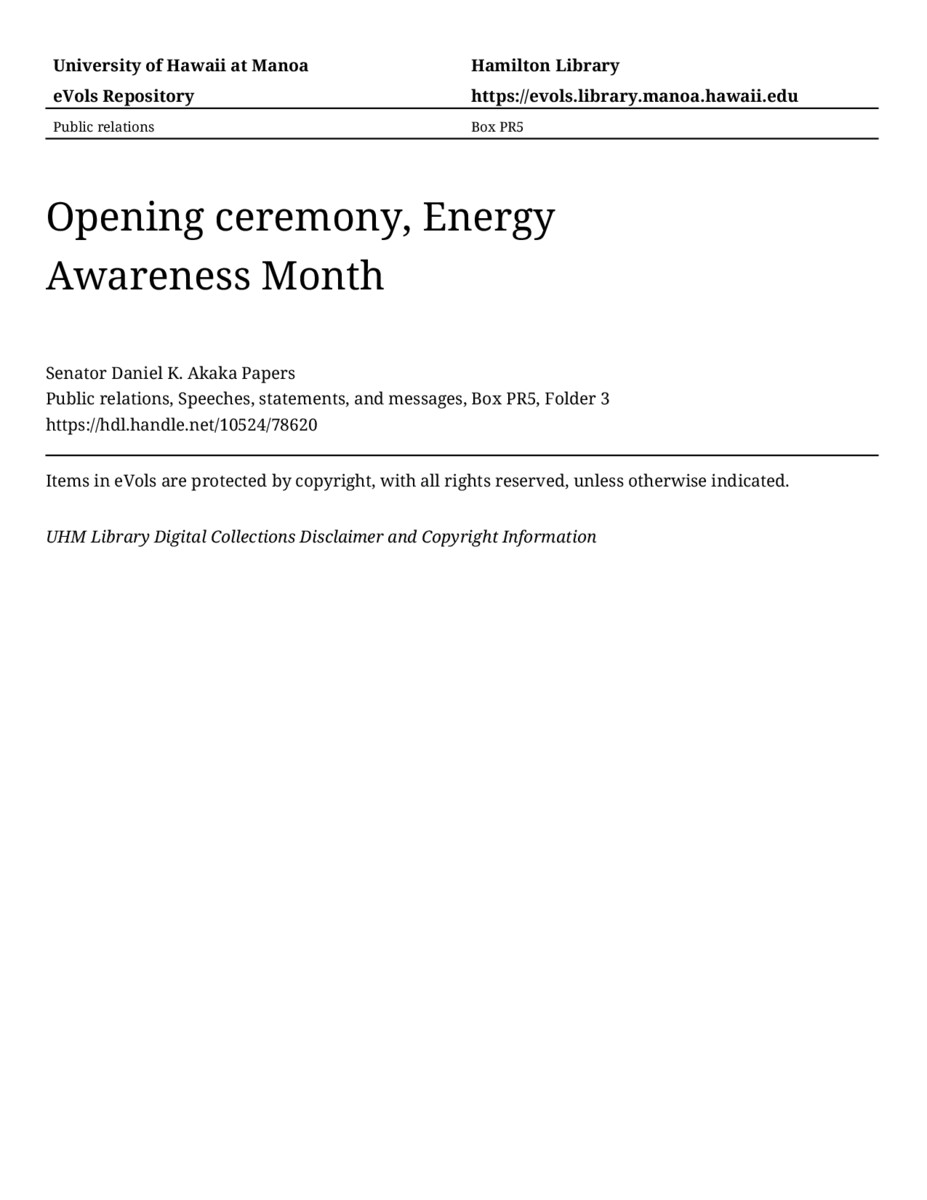 Opening ceremony, Energy Awareness Month, October 16, 1992, MANUSCRIPT-HCPC00010, Public relations, Speeches, statements, and messages, Box PR5, Folder 3, Senator Daniel K. Akaka Papers, Hawaiʻi Congressional Papers Collection, University of Hawaiʻi at Mānoa Library, Honolulu, HI. https://omekas-congress.lib.wvu.edu/catalog/10524_78620 (accessed April 13, 2026).