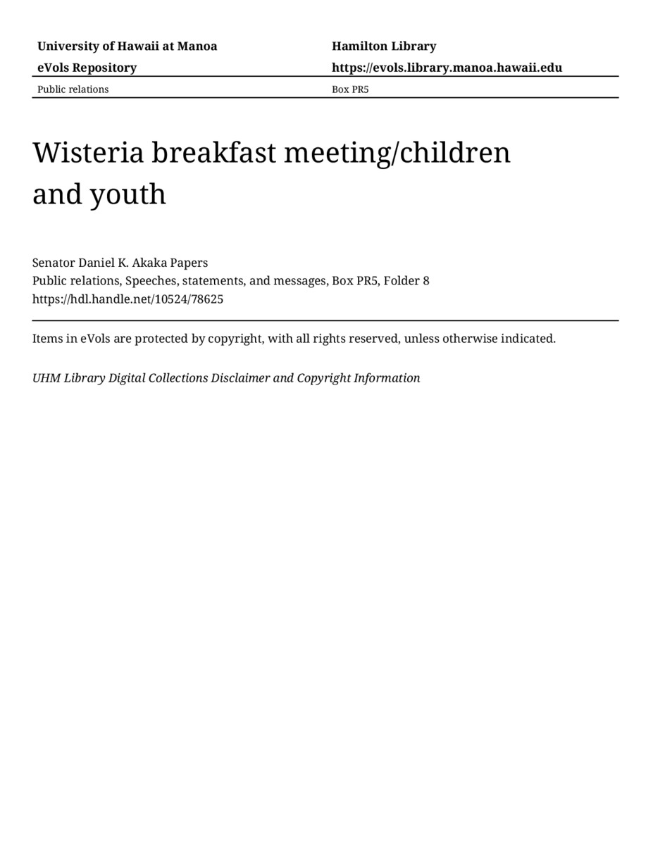 Wisteria breakfast meeting/children and youth, approximately October 22, 1992, MANUSCRIPT-HCPC00010, Public relations, Speeches, statements, and messages, Box PR5, Folder 8, Senator Daniel K. Akaka Papers, Hawaiʻi Congressional Papers Collection, University of Hawaiʻi at Mānoa Library, Honolulu, HI. https://omekas-congress.lib.wvu.edu/catalog/10524_78625 (accessed April 26, 2026).