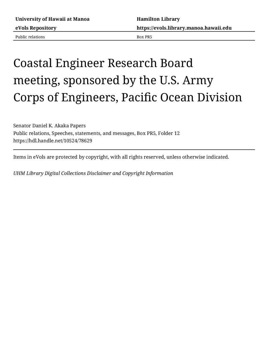 Coastal Engineer Research Board meeting, sponsored by the U.S. Army Corps of Engineers, Pacific Ocean Division, October 27, 1992, MANUSCRIPT-HCPC00010, Public relations, Speeches, statements, and messages, Box PR5, Folder 12, Senator Daniel K. Akaka Papers, Hawaiʻi Congressional Papers Collection, University of Hawaiʻi at Mānoa Library, Honolulu, HI. https://omekas-congress.lib.wvu.edu/catalog/10524_78629 (accessed April 18, 2026).