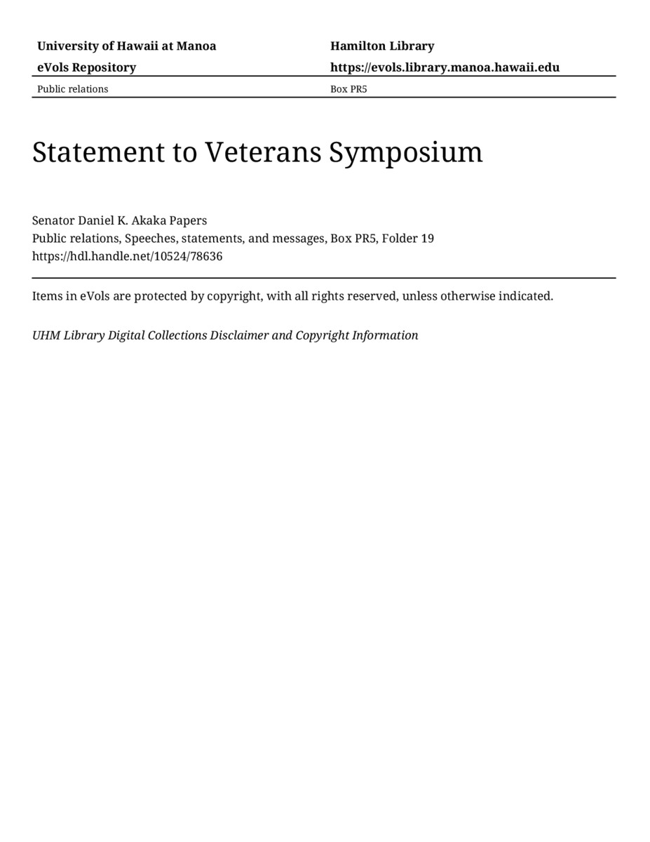 Statement to Veterans Symposium, November 6, 1992, MANUSCRIPT-HCPC00010, Public relations, Speeches, statements, and messages, Box PR5, Folder 19, Senator Daniel K. Akaka Papers, Hawaiʻi Congressional Papers Collection, University of Hawaiʻi at Mānoa Library, Honolulu, HI. https://omekas-congress.lib.wvu.edu/catalog/10524_78636 (accessed April 20, 2026).