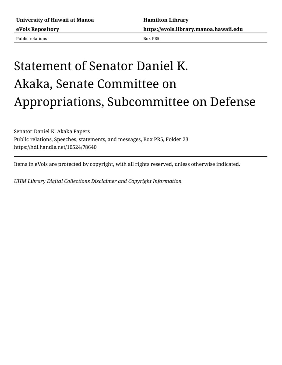 - Statement of Senator Daniel K. Akaka, Senate Committee on Appropriations, Subcommittee on Defense