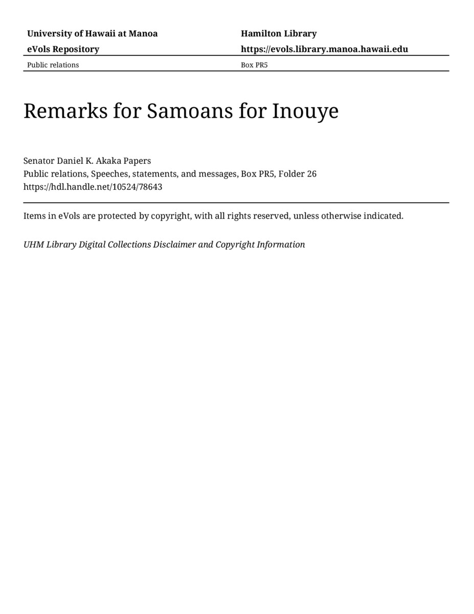 Remarks for Samoans for Inouye, approximately 1992, MANUSCRIPT-HCPC00010, Public relations, Speeches, statements, and messages, Box PR5, Folder 26, Senator Daniel K. Akaka Papers, Hawaiʻi Congressional Papers Collection, University of Hawaiʻi at Mānoa Library, Honolulu, HI. https://omekas-congress.lib.wvu.edu/catalog/10524_78643 (accessed April 21, 2026).