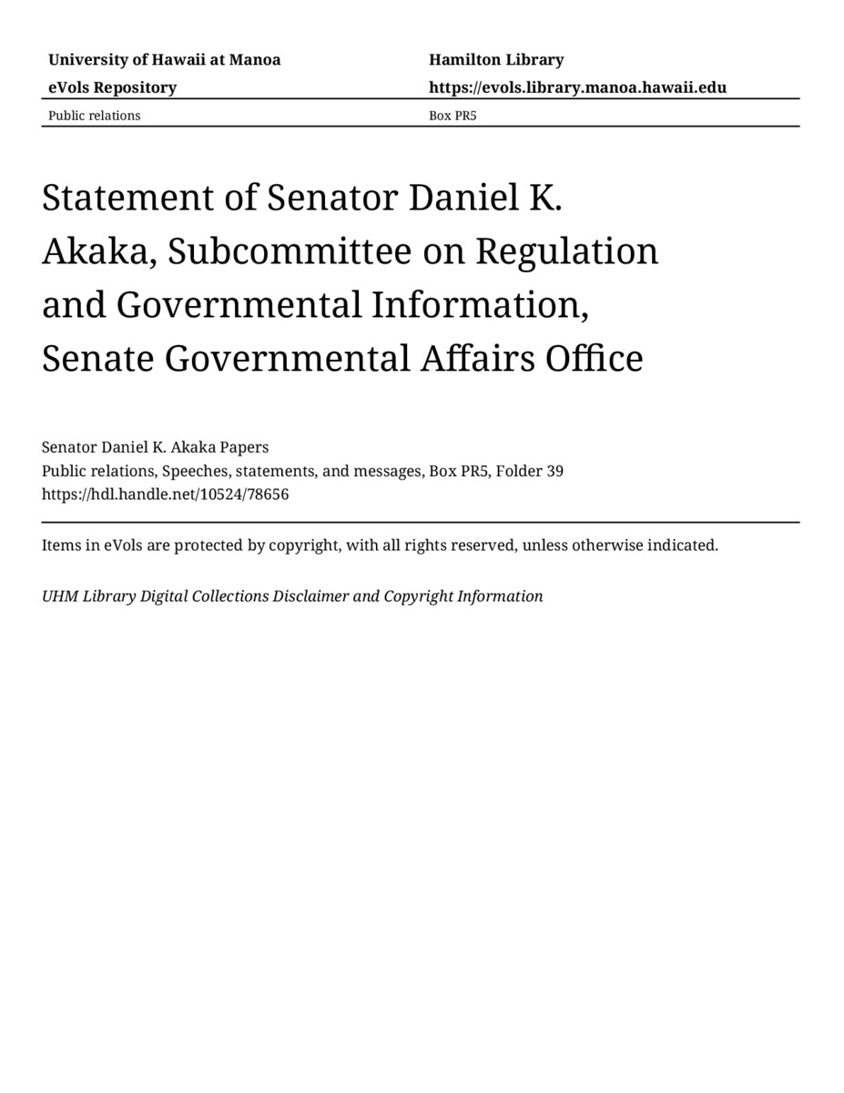 Statement of Senator Daniel K. Akaka, Subcommittee on Regulation and Governmental Information, Senate Governmental Affairs Office, February 19, 1993, MANUSCRIPT-HCPC00010, Public relations, Speeches, statements, and messages, Box PR5, Folder 39, Senator Daniel K. Akaka Papers, Hawaiʻi Congressional Papers Collection, University of Hawaiʻi at Mānoa Library, Honolulu, HI. https://omekas-congress.lib.wvu.edu/catalog/10524_78656 (accessed April 19, 2026).