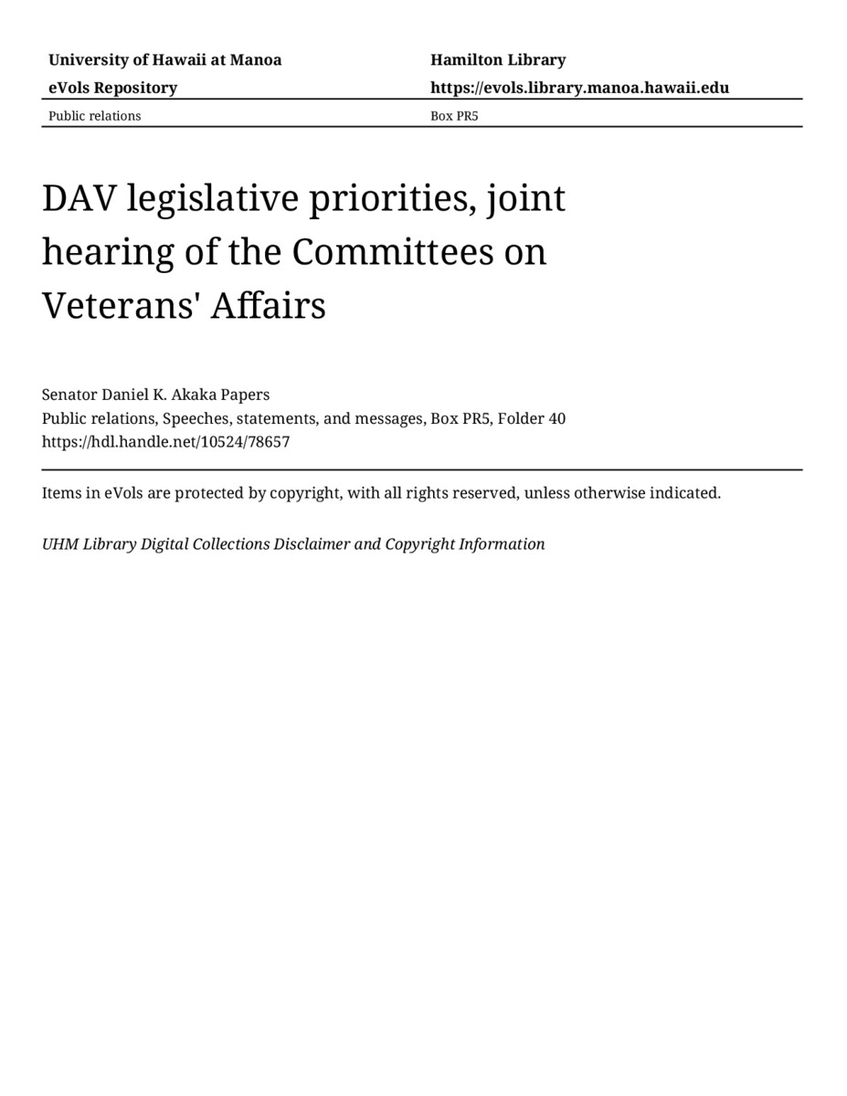 - DAV legislative priorities, joint hearing of the Committees on Veterans' Affairs