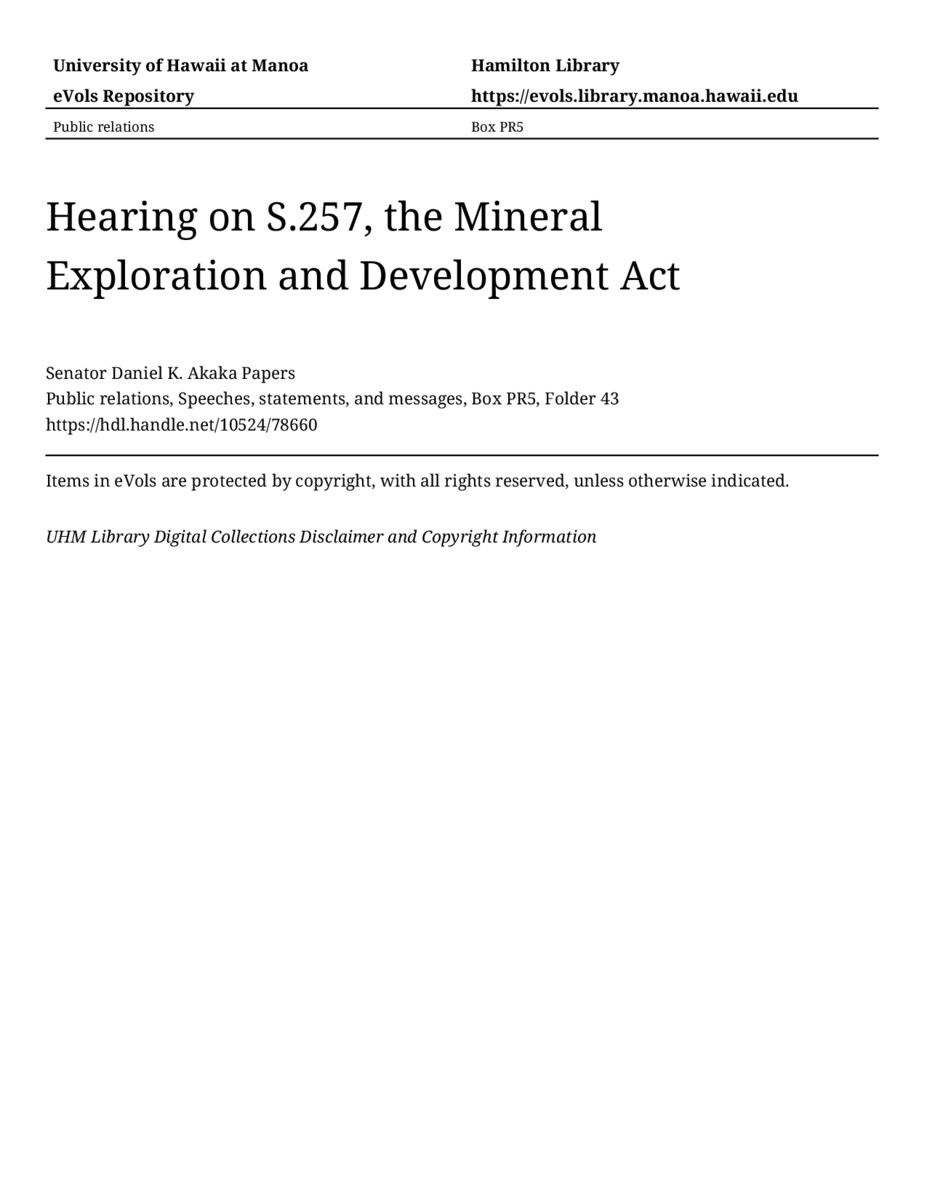 Hearing on S.257, the Mineral Exploration and Development Act, March 16, 1993, MANUSCRIPT-HCPC00010, Public relations, Speeches, statements, and messages, Box PR5, Folder 43, Senator Daniel K. Akaka Papers, Hawaiʻi Congressional Papers Collection, University of Hawaiʻi at Mānoa Library, Honolulu, HI. https://omekas-congress.lib.wvu.edu/catalog/10524_78660 (accessed April 19, 2026).