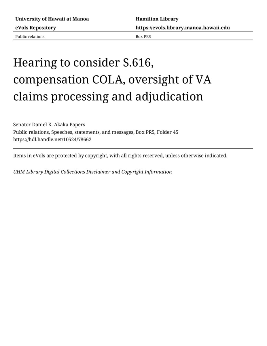 - Hearing to consider S.616, compensation COLA, oversight of VA claims processing and adjudication