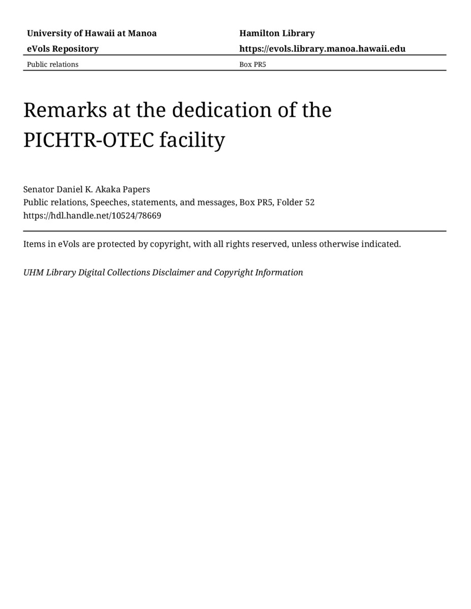 Remarks at the dedication of the PICHTR-OTEC facility, April 16, 1993, MANUSCRIPT-HCPC00010, Public relations, Speeches, statements, and messages, Box PR5, Folder 52, Senator Daniel K. Akaka Papers, Hawaiʻi Congressional Papers Collection, University of Hawaiʻi at Mānoa Library, Honolulu, HI. https://omekas-congress.lib.wvu.edu/catalog/10524_78669 (accessed April 13, 2026).