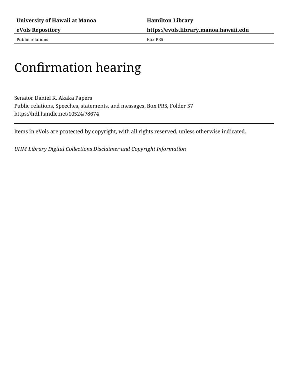 Confirmation hearing, April 27, 1993, MANUSCRIPT-HCPC00010, Public relations, Speeches, statements, and messages, Box PR5, Folder 57, Senator Daniel K. Akaka Papers, Hawaiʻi Congressional Papers Collection, University of Hawaiʻi at Mānoa Library, Honolulu, HI. https://omekas-congress.lib.wvu.edu/catalog/10524_78674 (accessed April 19, 2026).
