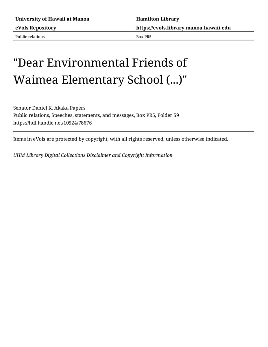 "Dear Environmental Friends of Waimea Elementary School (...)", approximately April 1993, MANUSCRIPT-HCPC00010, Public relations, Speeches, statements, and messages, Box PR5, Folder 59, Senator Daniel K. Akaka Papers, Hawaiʻi Congressional Papers Collection, University of Hawaiʻi at Mānoa Library, Honolulu, HI. https://omekas-congress.lib.wvu.edu/catalog/10524_78676 (accessed April 13, 2026).