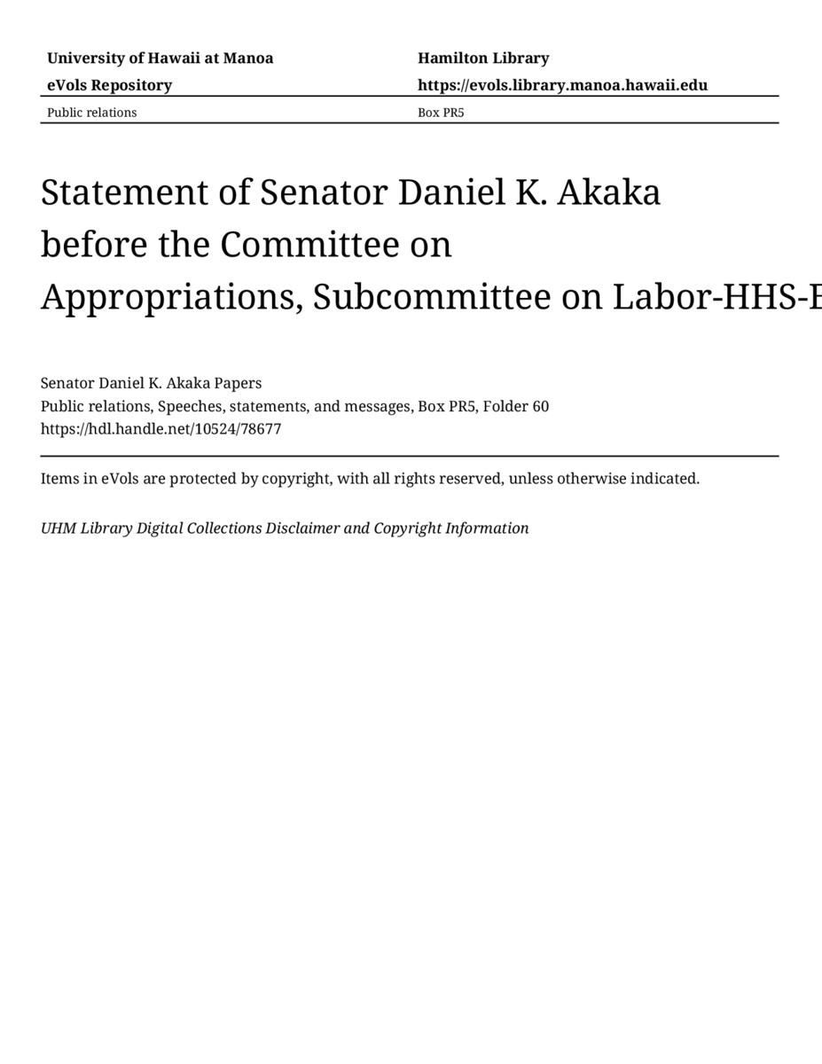 Statement of Senator Daniel K. Akaka before the Committee on Appropriations, Subcommittee on Labor-HHS-Education, May 3, 1993, MANUSCRIPT-HCPC00010, Public relations, Speeches, statements, and messages, Box PR5, Folder 60, Senator Daniel K. Akaka Papers, Hawaiʻi Congressional Papers Collection, University of Hawaiʻi at Mānoa Library, Honolulu, HI. https://omekas-congress.lib.wvu.edu/catalog/10524_78677 (accessed April 18, 2026).
