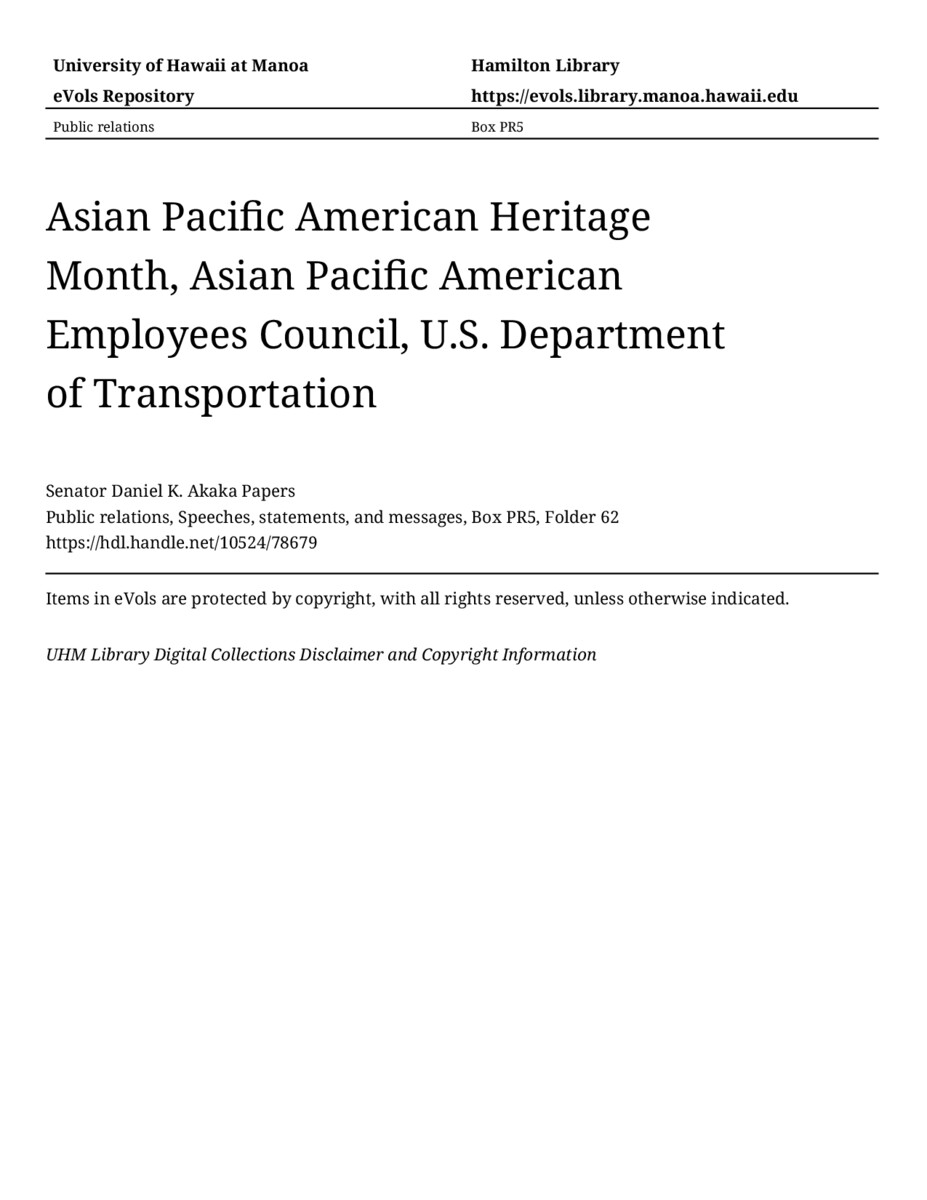Asian Pacific American Heritage Month, Asian Pacific American Employees Council, U.S. Department of Transportation, May 5, 1993, MANUSCRIPT-HCPC00010, Public relations, Speeches, statements, and messages, Box PR5, Folder 62, Senator Daniel K. Akaka Papers, Hawaiʻi Congressional Papers Collection, University of Hawaiʻi at Mānoa Library, Honolulu, HI. https://omekas-congress.lib.wvu.edu/catalog/10524_78679 (accessed April 21, 2026).