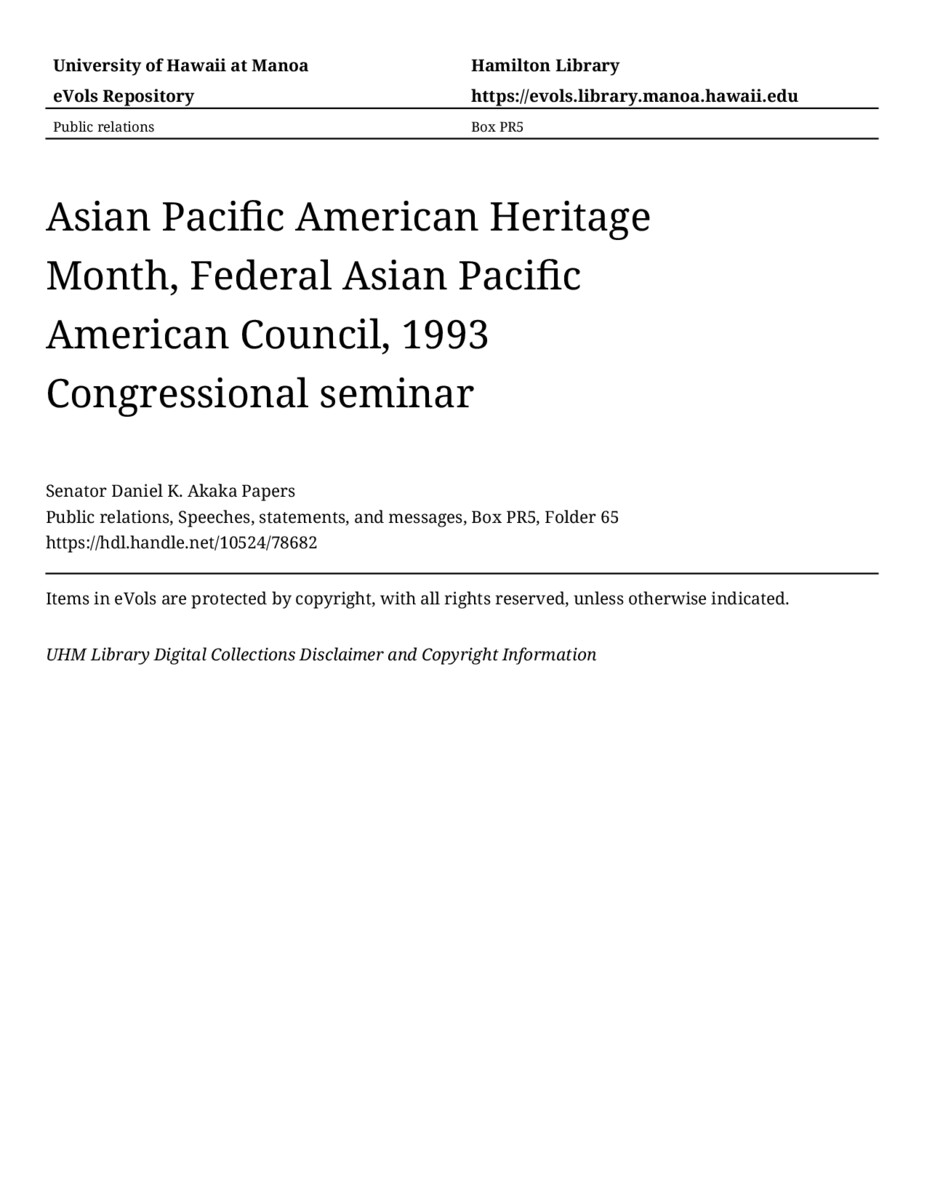 - Asian Pacific American Heritage Month, Federal Asian Pacific American Council, 1993 Congressional seminar