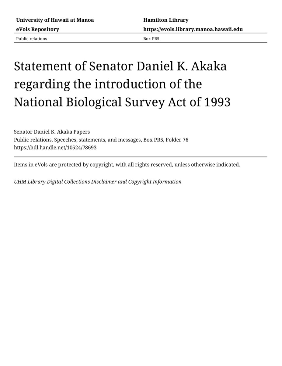 Statement of Senator Daniel K. Akaka regarding the introduction of the National Biological Survey Act of 1993, June 15, 1993, MANUSCRIPT-HCPC00010, Public relations, Speeches, statements, and messages, Box PR5, Folder 76, Senator Daniel K. Akaka Papers, Hawaiʻi Congressional Papers Collection, University of Hawaiʻi at Mānoa Library, Honolulu, HI. https://omekas-congress.lib.wvu.edu/catalog/10524_78693 (accessed April 09, 2026).