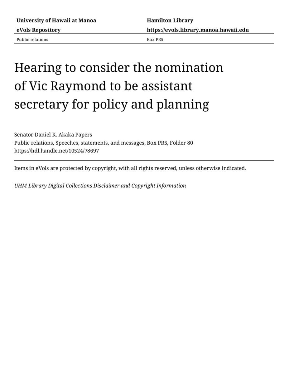 Hearing to consider the nomination of Vic Raymond to be assistant secretary for policy and planning