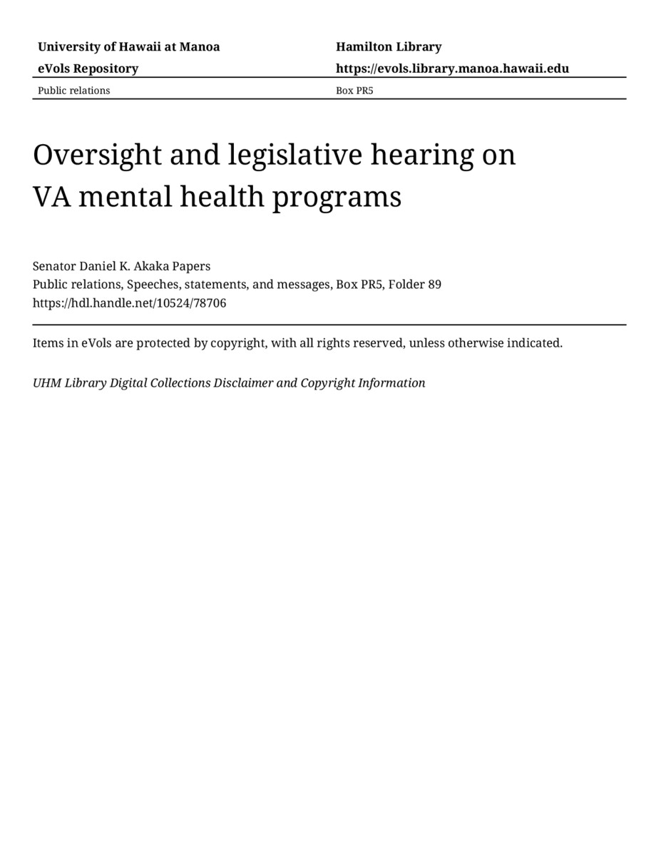 Oversight and legislative hearing on VA mental health programs, August 3, 1993, MANUSCRIPT-HCPC00010, Public relations, Speeches, statements, and messages, Box PR5, Folder 89, Senator Daniel K. Akaka Papers, Hawaiʻi Congressional Papers Collection, University of Hawaiʻi at Mānoa Library, Honolulu, HI. https://omekas-congress.lib.wvu.edu/catalog/10524_78706 (accessed April 17, 2026).