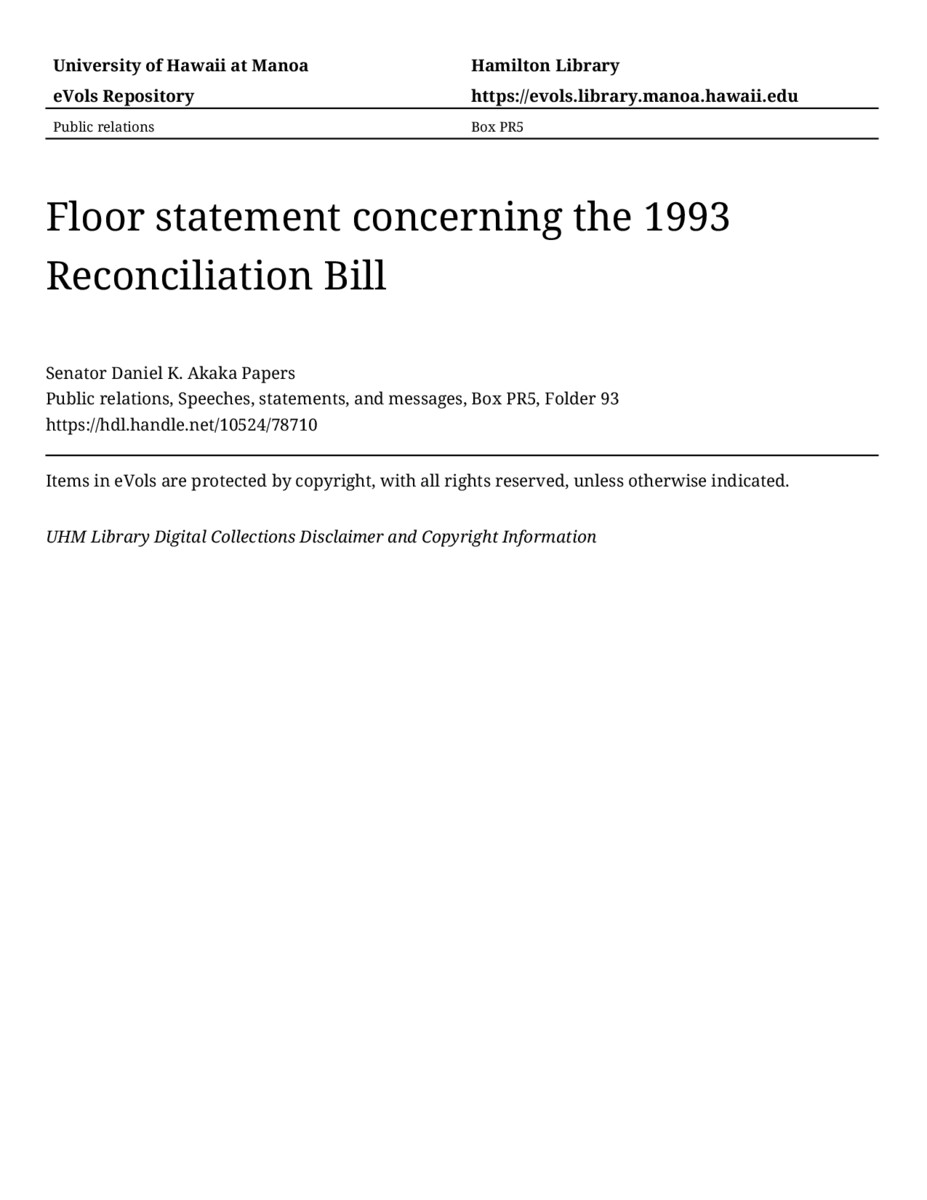 Floor statement concerning the 1993 Reconciliation Bill, August 6, 1993-August 9, 1993, MANUSCRIPT-HCPC00010, Public relations, Speeches, statements, and messages, Box PR5, Folder 93, Senator Daniel K. Akaka Papers, Hawaiʻi Congressional Papers Collection, University of Hawaiʻi at Mānoa Library, Honolulu, HI. https://omekas-congress.lib.wvu.edu/catalog/10524_78710 (accessed April 21, 2026).