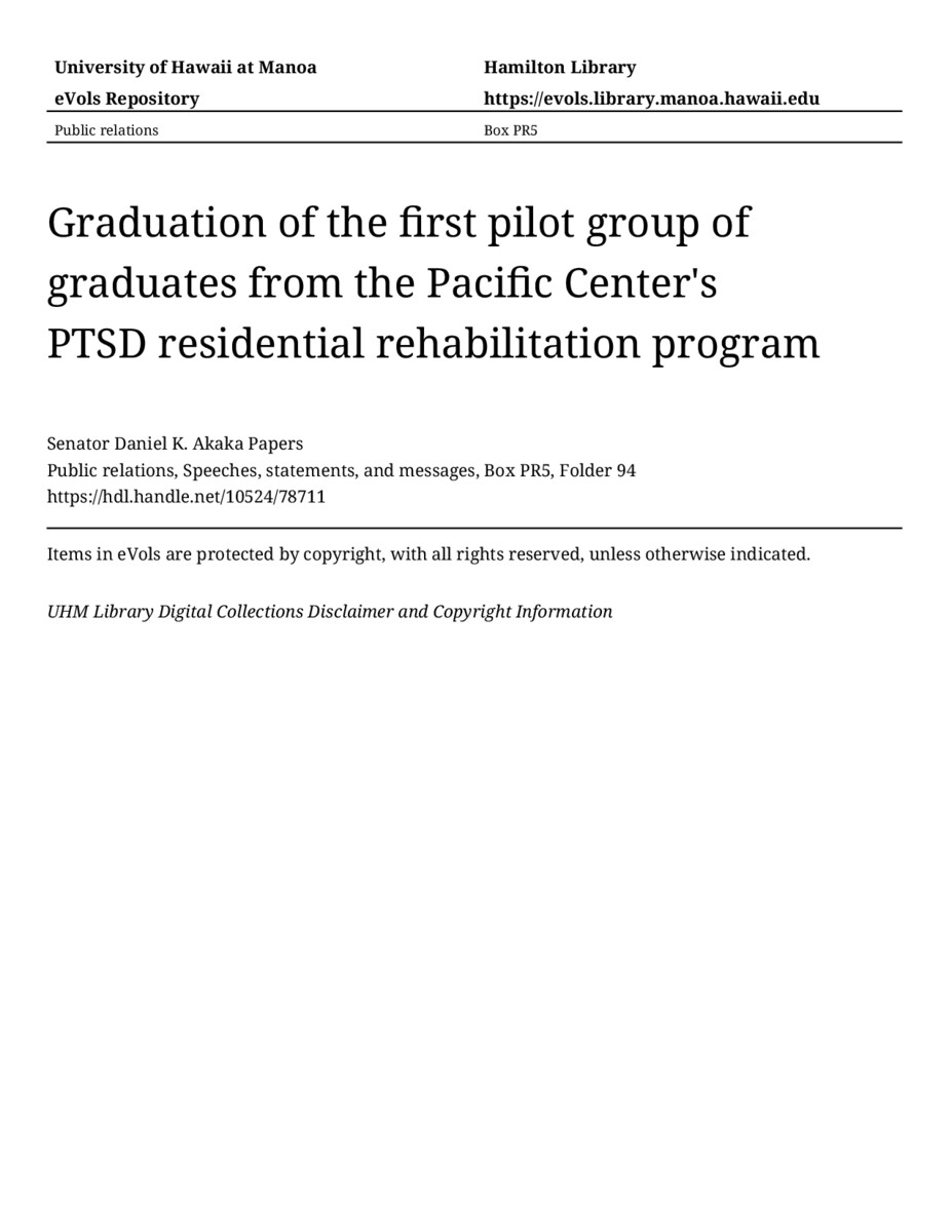 Graduation of the first pilot group of graduates from the Pacific Center's PTSD residential rehabilitation program, August 12, 1993, MANUSCRIPT-HCPC00010, Public relations, Speeches, statements, and messages, Box PR5, Folder 94, Senator Daniel K. Akaka Papers, Hawaiʻi Congressional Papers Collection, University of Hawaiʻi at Mānoa Library, Honolulu, HI. https://omekas-congress.lib.wvu.edu/catalog/10524_78711 (accessed April 17, 2026).