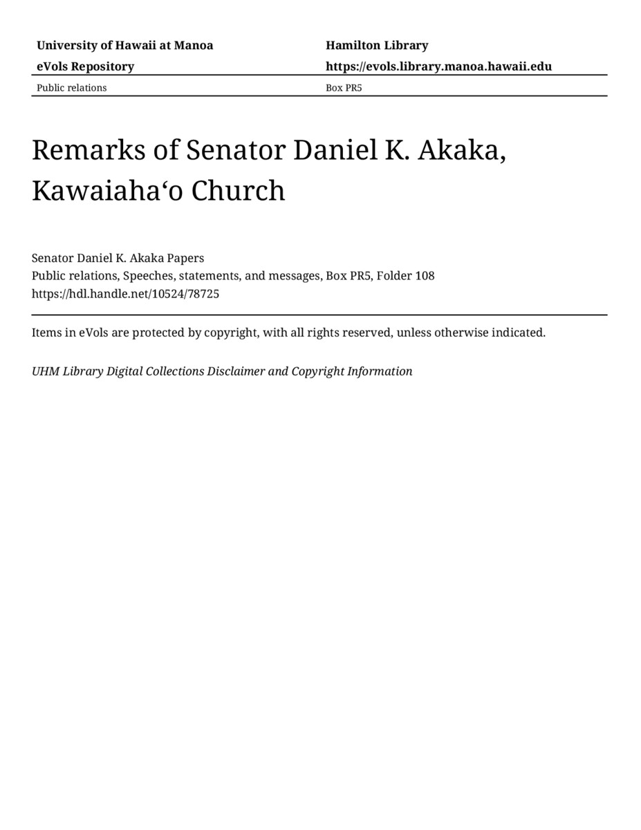 Remarks of Senator Daniel K. Akaka, Kawaiahaʻo Church, December 29, 1993, MANUSCRIPT-HCPC00010, Public relations, Speeches, statements, and messages, Box PR5, Folder 108, Senator Daniel K. Akaka Papers, Hawaiʻi Congressional Papers Collection, University of Hawaiʻi at Mānoa Library, Honolulu, HI. https://omekas-congress.lib.wvu.edu/catalog/10524_78725 (accessed April 16, 2026).
