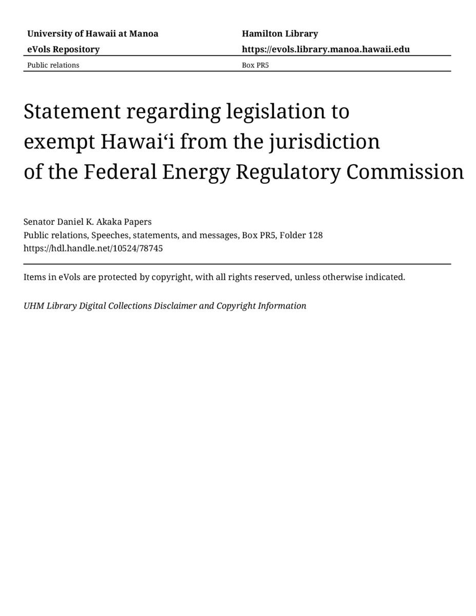 Statement regarding legislation to exempt Hawaiʻi from the jurisdiction of the Federal Energy Regulatory Commission, May 13, 1994, MANUSCRIPT-HCPC00010, Public relations, Speeches, statements, and messages, Box PR5, Folder 128, Senator Daniel K. Akaka Papers, Hawaiʻi Congressional Papers Collection, University of Hawaiʻi at Mānoa Library, Honolulu, HI. https://omekas-congress.lib.wvu.edu/catalog/10524_78745 (accessed April 13, 2026).